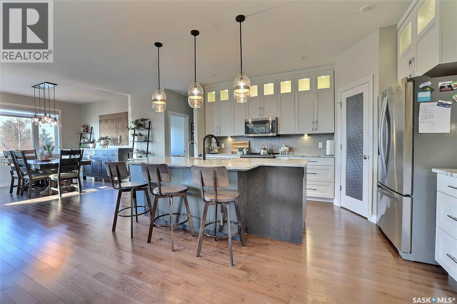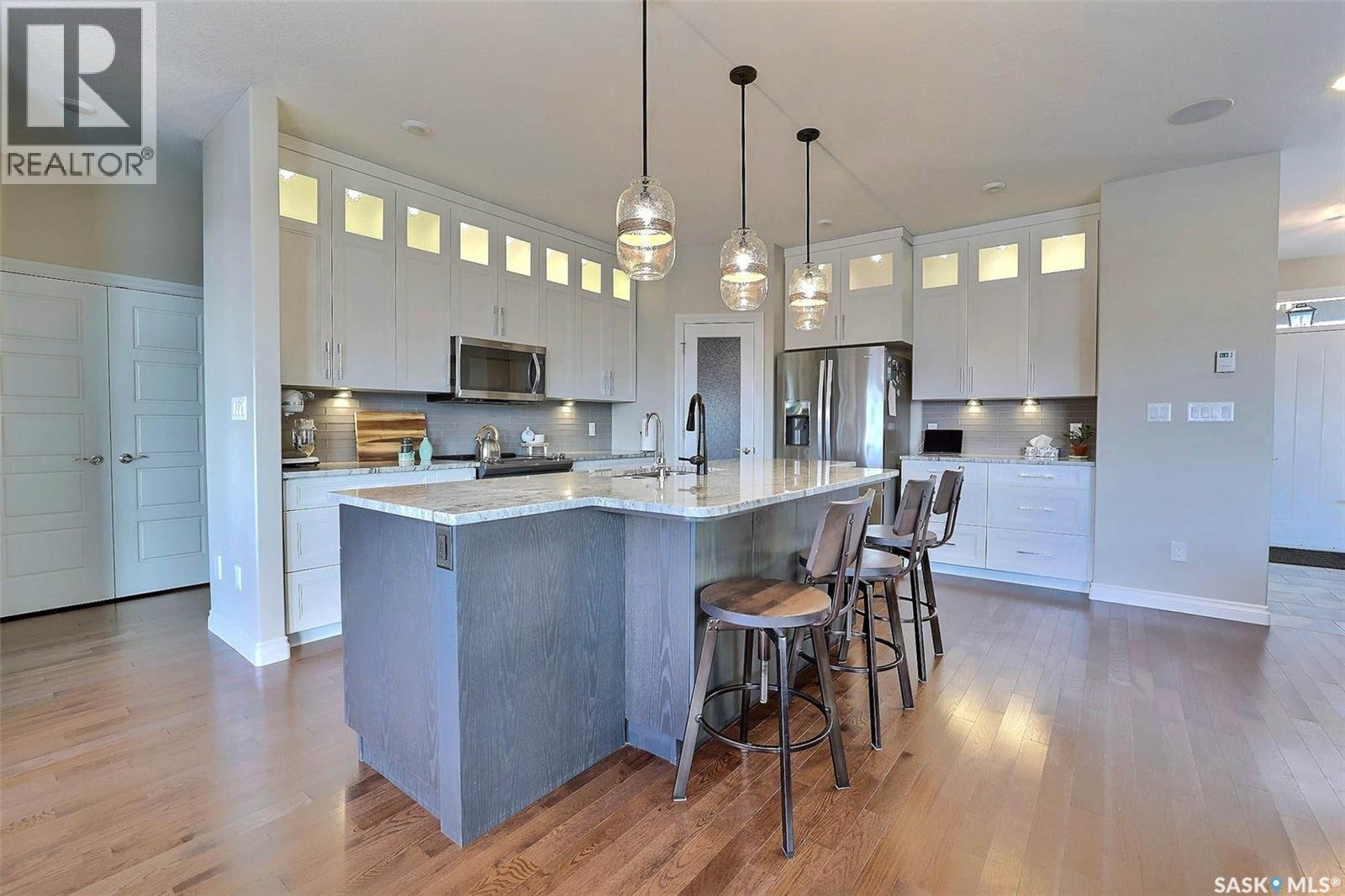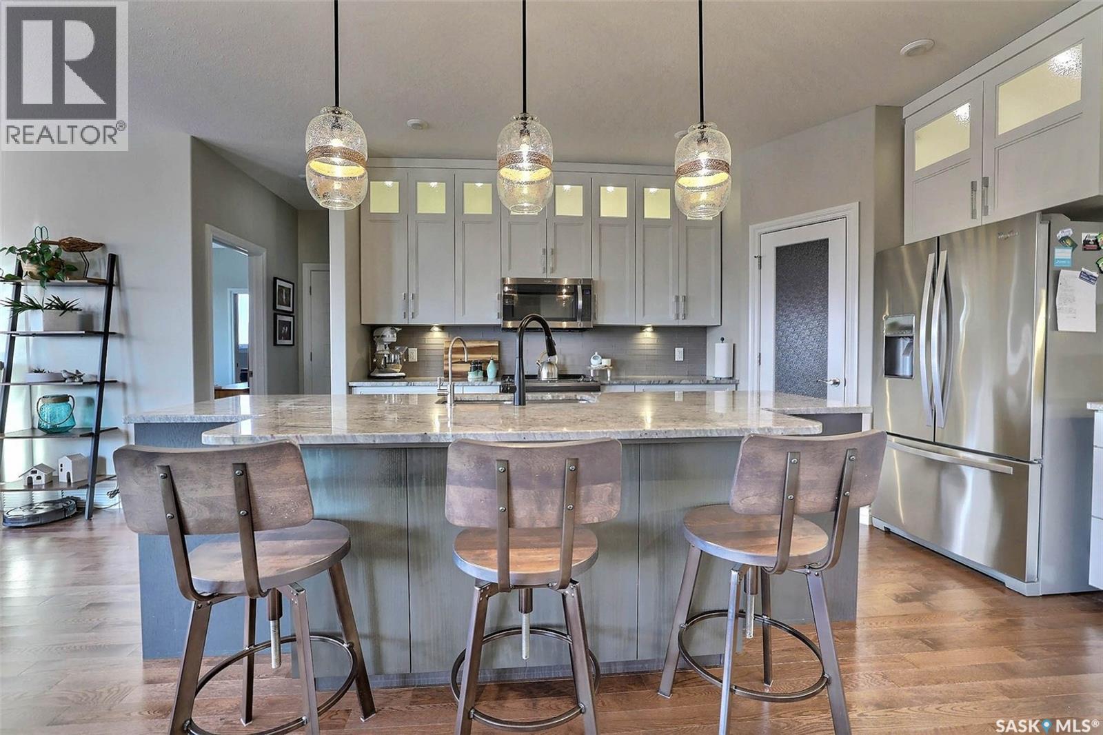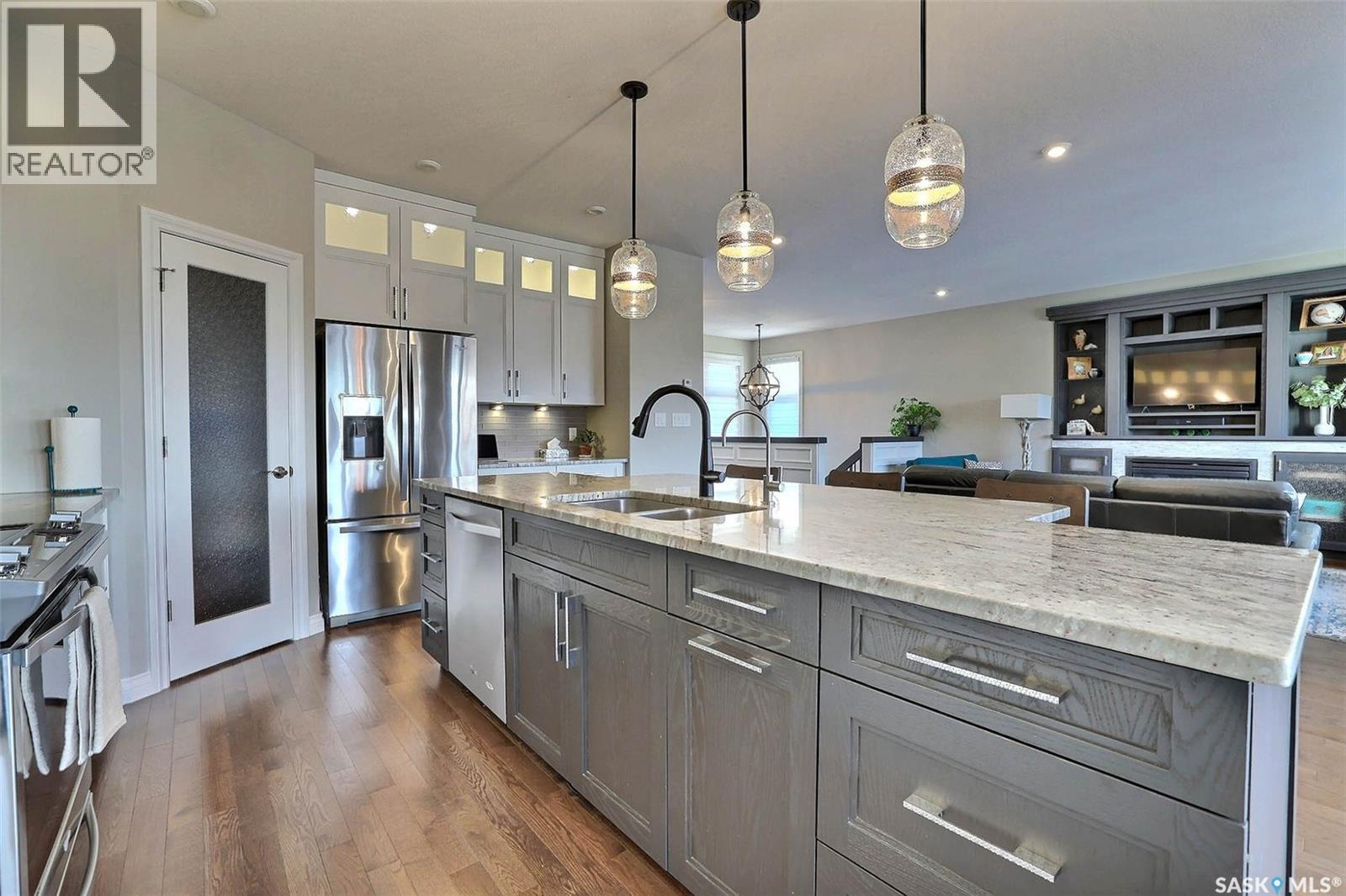 Absolutely stunning former Emerald Park Homes Showhome. Meticulously kept this beautiful fully developed bungalow is better than new. Spacious, open layout has large front entry leading to generously sized living area boasting fireplace feature wall and custom built-ins, chef's dream gourmet kitchen with massive eat up island, custom granite countertops, high quality custom cabinetry to the ceiling are interiorly backlit, pantry and glass tile backsplash. Family sized dining area and abundance of south and west facing oversized windows flood the main floor with natural light along with gorgeous like new high quality hardwood floors throughout living areas. Large primary suite with 3pc ensuite featuring oversized shower, double vanity and walk in closet with custom shelving. 2nd bedroom generously sized. Main floor laundry with additional builder grade cabinets plus folding counterspace. Large, versatile mudroom off the front entry with lockers plus 2 extra closets for more storage. Direct entry to massive mechanics dream 31x28 triple attached garage. Heated, wired 220 and finished with extra height doors. Builder dev bsmt accessed by beautiful open rail custom staircase featuring 2 large corner front windows for extra brightness. Massive RR with fireplace feature wall, with large storage closets. 2 oversized large bedrooms with big windows very handy media room/den office and another 4pc bath plus and bonus 2nd laundry in utility room. Gorgeous, professionally landscaped and well treed private rear yard has a large maintenance free deck leading to lower custom stone patio with firepit feature. Additional pad for future hottub (wiring ready) large shed, lush lawn and tiered garden planter boxes. Underground sprinklers both front and back with drip lines for every tree and shrub on timers and handy dog run. So many upgrades and special features including all appliances, gemstone lighting on entire home, Home audio surround sound throughout. Call today! (id:6769)