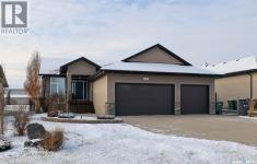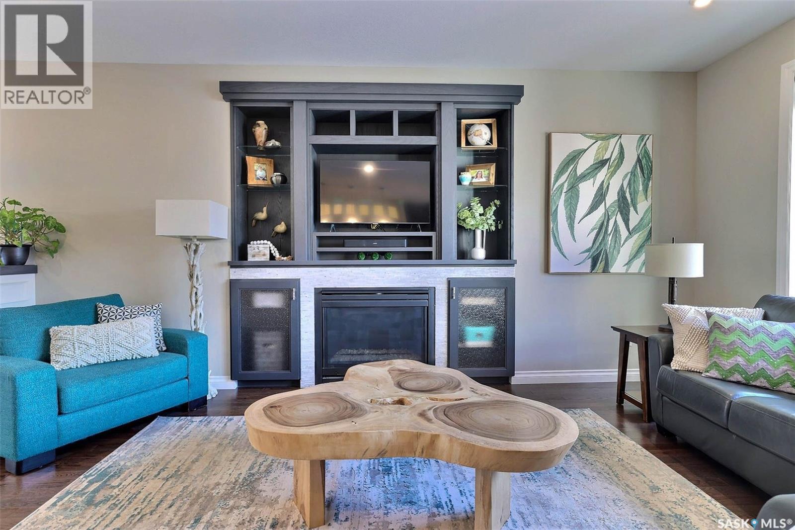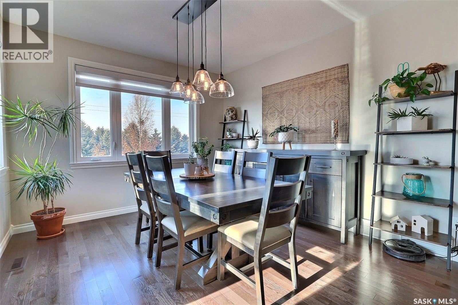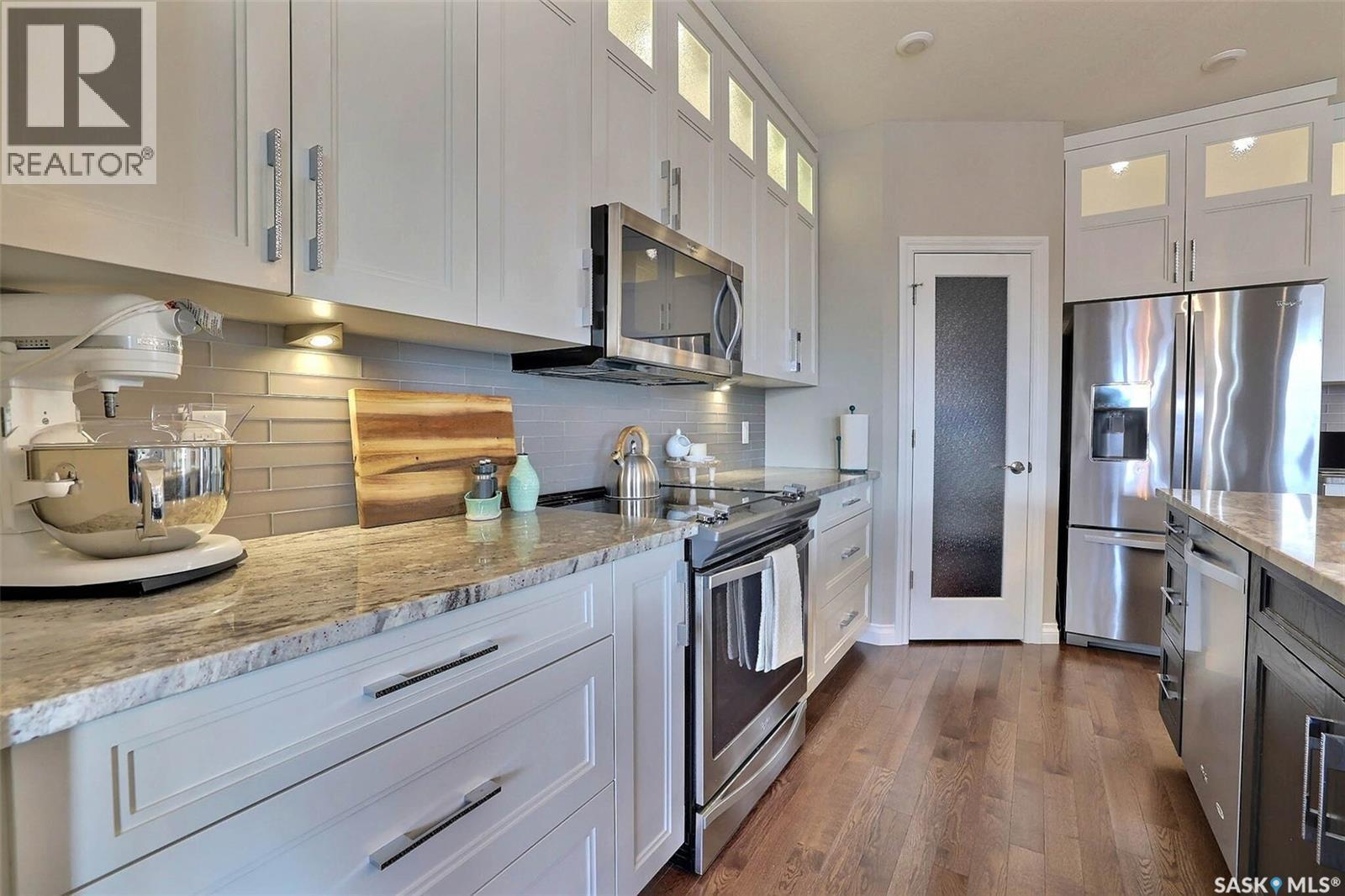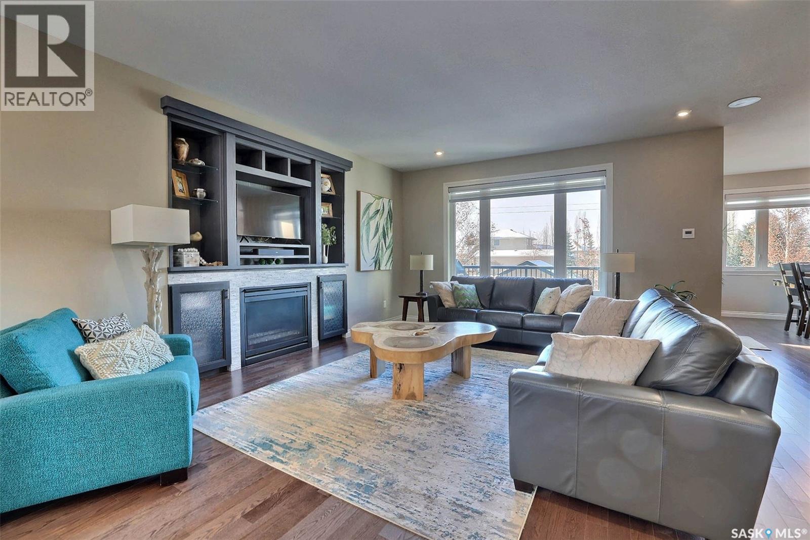 Absolutely stunning former Emerald Park Homes Showhome. Meticulously kept this beautiful fully developed bungalow is better than new. Spacious, open layout has large front entry leading to generously sized living area boasting fireplace feature wall and custom built-ins, chef's dream gourmet kitchen with massive eat up island, custom granite countertops, high quality custom cabinetry to the ceiling are interiorly backlit, pantry and glass tile backsplash. Family sized dining area and abundance of south and west facing oversized windows flood the main floor with natural light along with gorgeous like new high quality hardwood floors throughout living areas. Large primary suite with 3pc ensuite featuring oversized shower, double vanity and walk in closet with custom shelving. 2nd bedroom generously sized. Main floor laundry with additional builder grade cabinets plus folding counterspace. Large, versatile mudroom off the front entry with lockers plus 2 extra closets for more storage. Direct entry to massive mechanics dream 31x28 triple attached garage. Heated, wired 220 and finished with extra height doors. Builder dev bsmt accessed by beautiful open rail custom staircase featuring 2 large corner front windows for extra brightness. Massive RR with fireplace feature wall, with large storage closets. 2 oversized large bedrooms with big windows very handy media room/den office and another 4pc bath plus and bonus 2nd laundry in utility room. Gorgeous, professionally landscaped and well treed private rear yard has a large maintenance free deck leading to lower custom stone patio with firepit feature. Additional pad for future hottub (wiring ready) large shed, lush lawn and tiered garden planter boxes. Underground sprinklers both front and back with drip lines for every tree and shrub on timers and handy dog run. So many upgrades and special features including all appliances, gemstone lighting on entire home, Home audio surround sound throughout. Call today! (id:6769)