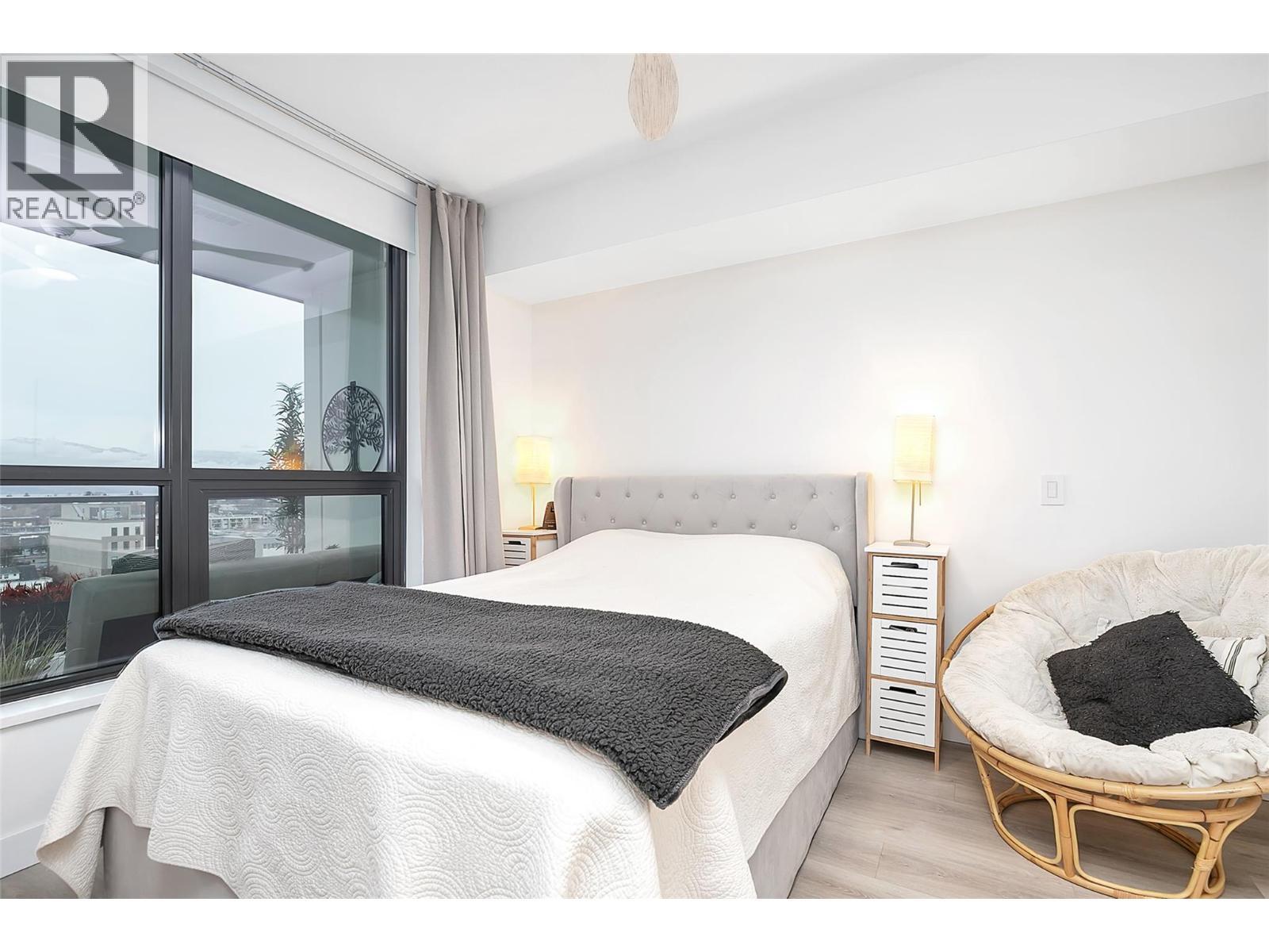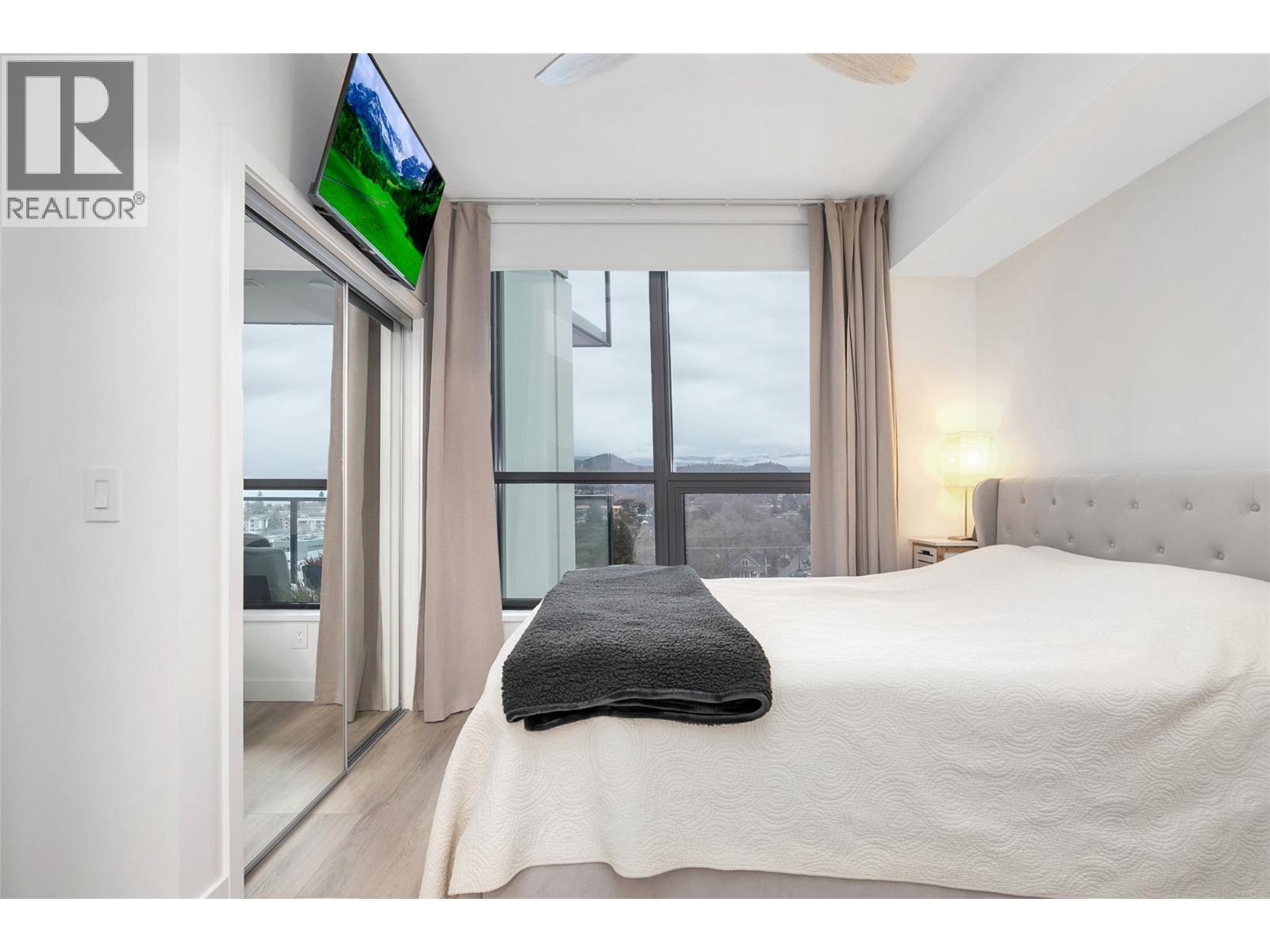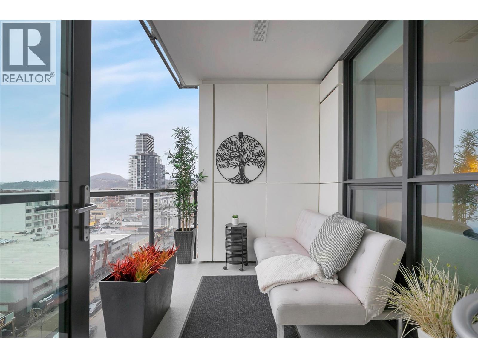 Welcome to Bertram — this 2-bedroom, 2-bathroom condo on the 9th floor is located walking distance to Lake Okanagan. Built in 2024, this bright southeast-facing corner unit showcases lake, city, and valley views through large windows that flood the home with natural light. This thoughtfully designed 805 sq. ft. residence features a split-bedroom layout for privacy, air conditioning, and an open-concept living space ideal for modern living. The sleek contemporary kitchen is equipped with quartz countertops, stainless steel appliances, and clean modern finishes. Step out to your covered deck and enjoy your morning coffee with a view. Residents enjoy impressive resort-style amenities, including a rooftop heated pool and spacious hot tub with 360-degree views, outdoor BBQ and lounge areas, bocce ball court, community gardens, a fully equipped fitness centre, dog run and dog wash, secure bike room, and multiple indoor lounges and workspaces. Included are one secure parking stall and a dedicated storage locker and a secured bike locker. Experience true lock-and-leave convenience, just steps to Okanagan Lake, waterfront walking paths, groceries, shopping, Pilates studios, and some of Kelowna’s best restaurants. (id:6769)
