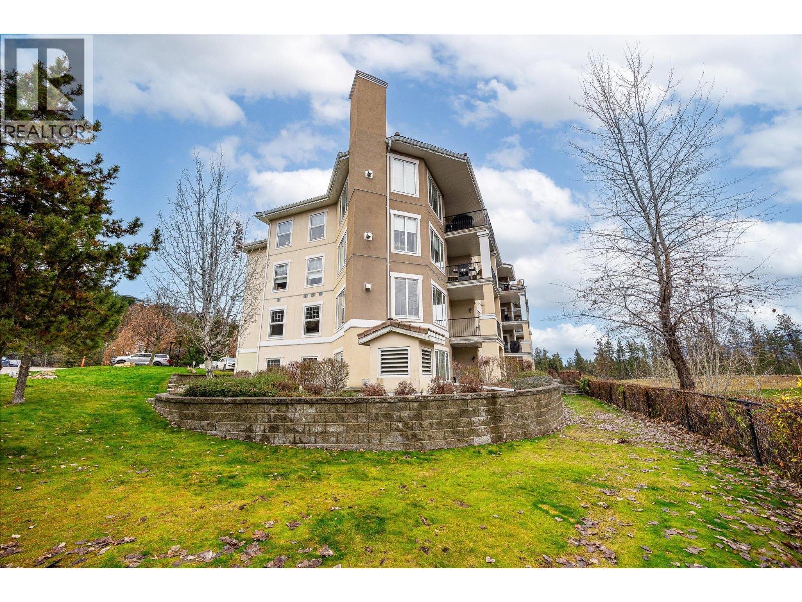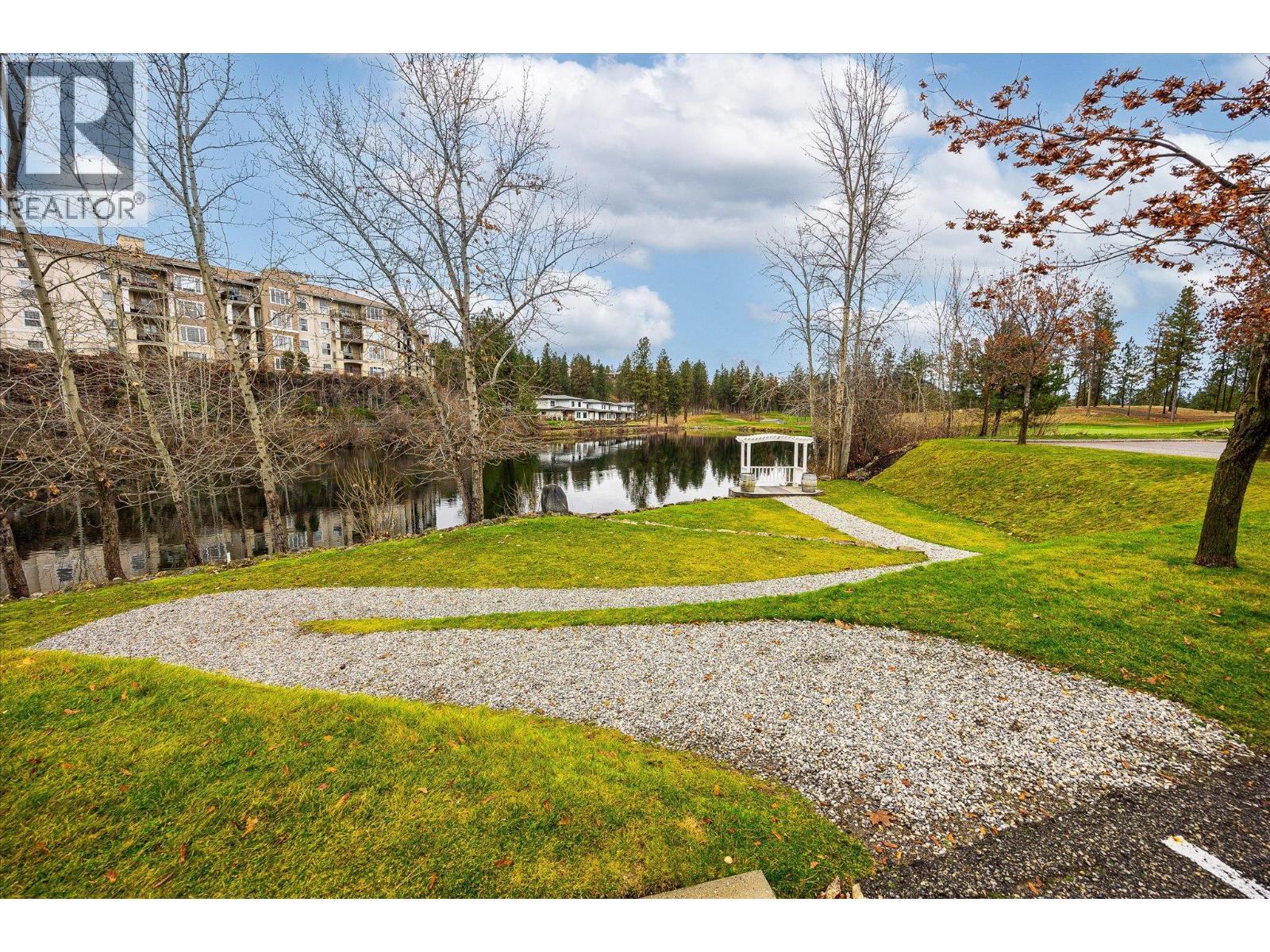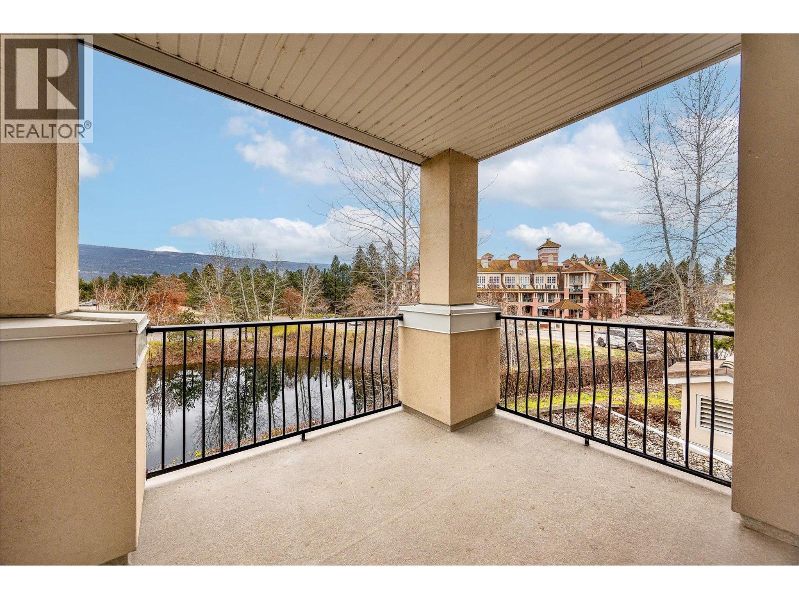Welcome to The Pointe at Quail Ridge, in Kelowna’s sought-after University District. This vacant, move in ready corner end-unit offers rare privacy with no neighbours on either side and stunning 270-degree views through six large windows overlooking the man-made lake, the 18th hole of Quail Golf Course, and the clubhouse. At 1435 sq. ft this spacious two-bedroom plus den layout is one of the largest available and the best-priced per square foot in the area. The home features engineered hardwood floors, fresh paint, coffered ceilings with double crown moulding, a dramatic floor-to-ceiling gas fireplace, custom blinds, and exceptional storage including a fully shelved pantry and in-unit storage room. The kitchen boasts marble countertops, an oversized island/bar seating four, and ample cabinetry for all your culinary needs. The primary suite includes a luxurious jetted tub, while the private covered deck with gas BBQ hookup provides the perfect spot to relax and take in serene golf course and pond views. Additional highlights secure fob entry, one parking stall, bike storage, and access to the building’s pool and hot tub. Ideally located just five minutes from Kelowna International Airport, within walking distance to the Quail Golf clubhouse, and close to UBCO, wineries, trails, shopping, and dining, this home combines space, light, luxury, and convenience in a quiet, resort-style setting. Move-in-ready condo with panoramic views in one of Kelowna’s most desirable communities. (id:6769)
