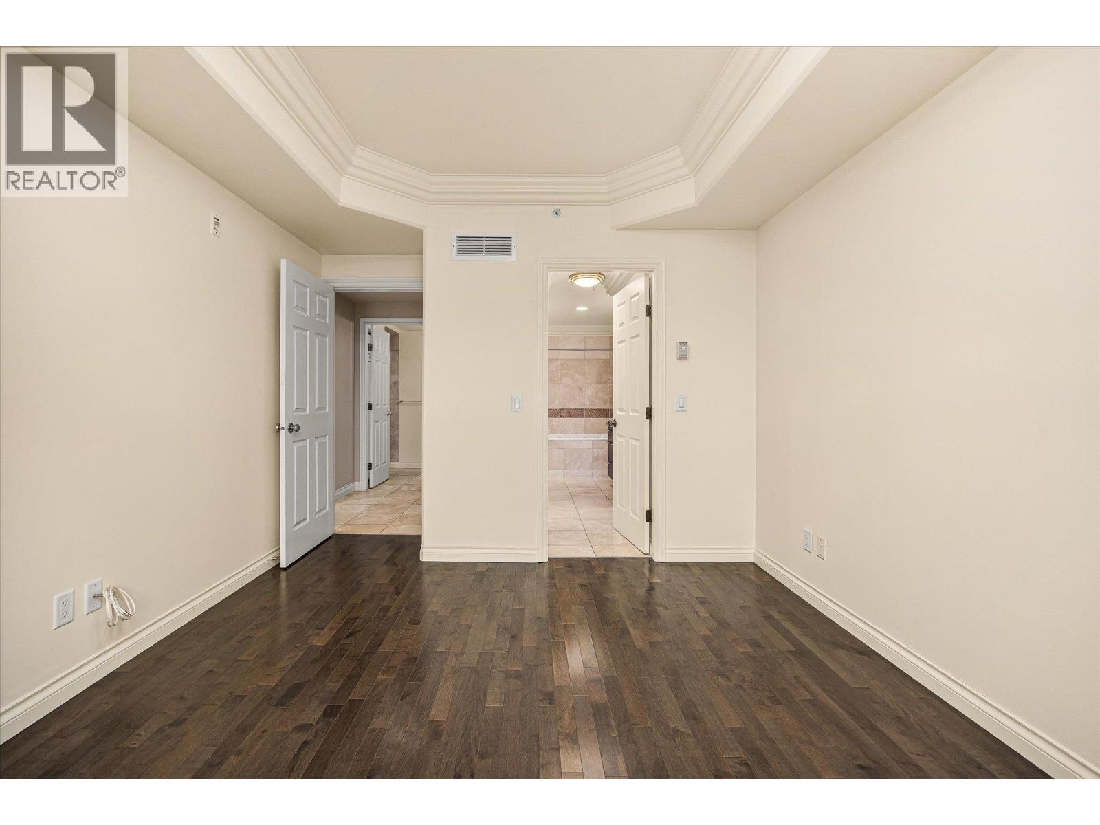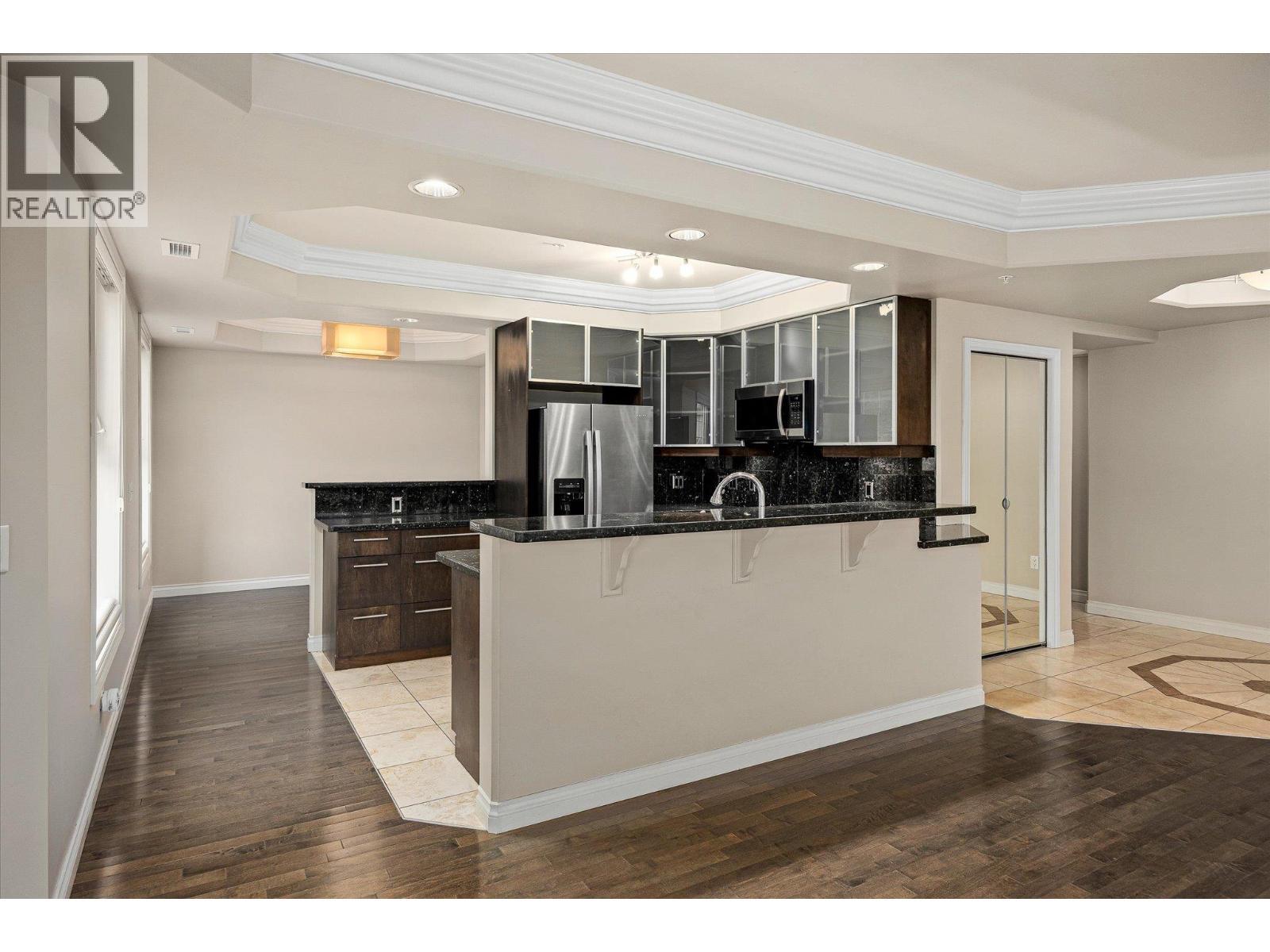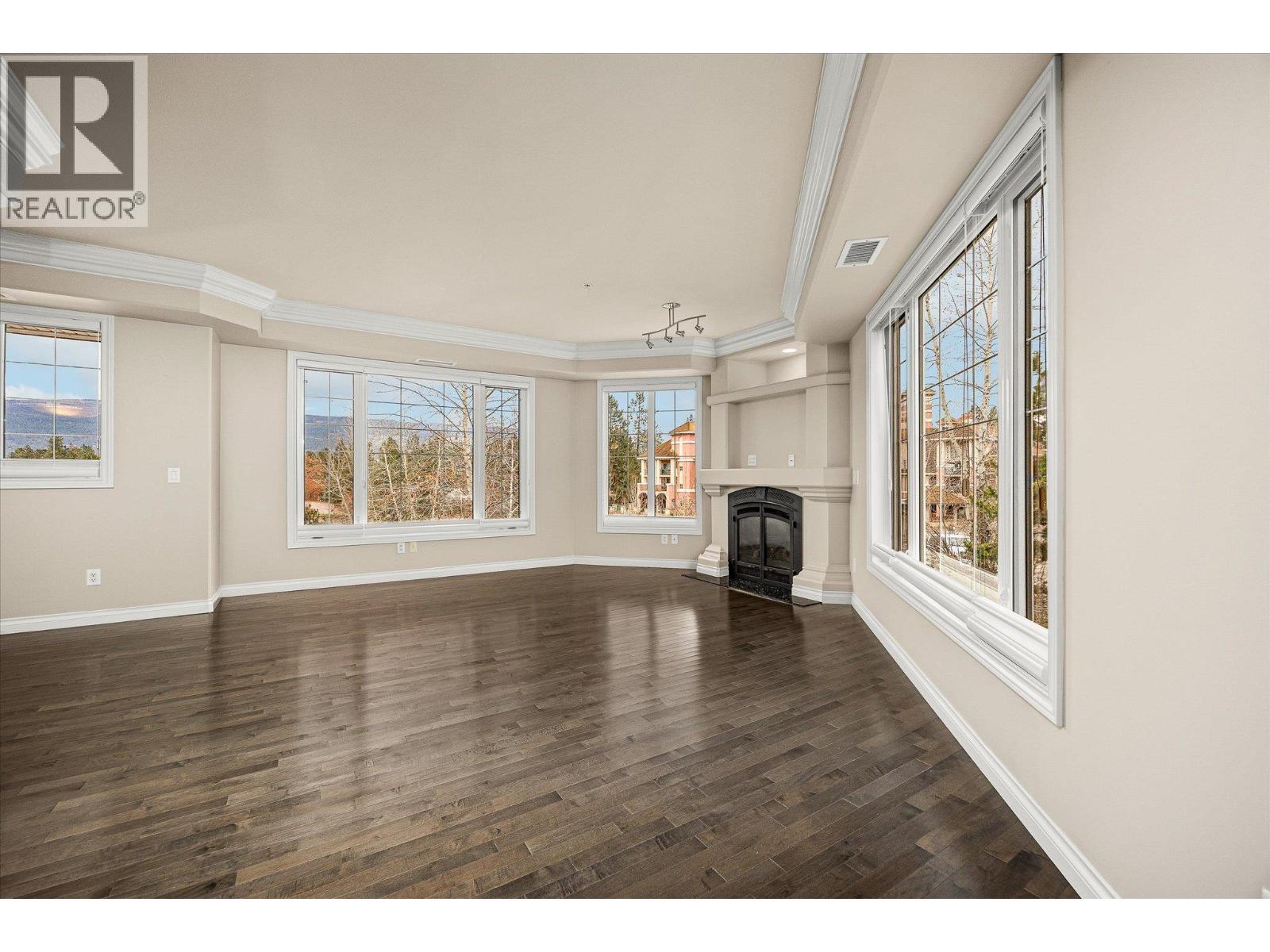 Welcome to The Pointe at Quail Ridge, in Kelowna’s sought-after University District. This vacant, move in ready corner end-unit offers rare privacy with no neighbours on either side and stunning 270-degree views through six large windows overlooking the man-made lake, the 18th hole of Quail Golf Course, and the clubhouse. At 1435 sq. ft this spacious two-bedroom plus den layout is one of the largest available and the best-priced per square foot in the area. The home features engineered hardwood floors, fresh paint, coffered ceilings with double crown moulding, a dramatic floor-to-ceiling gas fireplace, custom blinds, and exceptional storage including a fully shelved pantry and in-unit storage room. The kitchen boasts marble countertops, an oversized island/bar seating four, and ample cabinetry for all your culinary needs. The primary suite includes a luxurious jetted tub, while the private covered deck with gas BBQ hookup provides the perfect spot to relax and take in serene golf course and pond views. Additional highlights secure fob entry, one parking stall, bike storage, and access to the building’s pool and hot tub. Ideally located just five minutes from Kelowna International Airport, within walking distance to the Quail Golf clubhouse, and close to UBCO, wineries, trails, shopping, and dining, this home combines space, light, luxury, and convenience in a quiet, resort-style setting. Move-in-ready condo with panoramic views in one of Kelowna’s most desirable communities. (id:6769)
