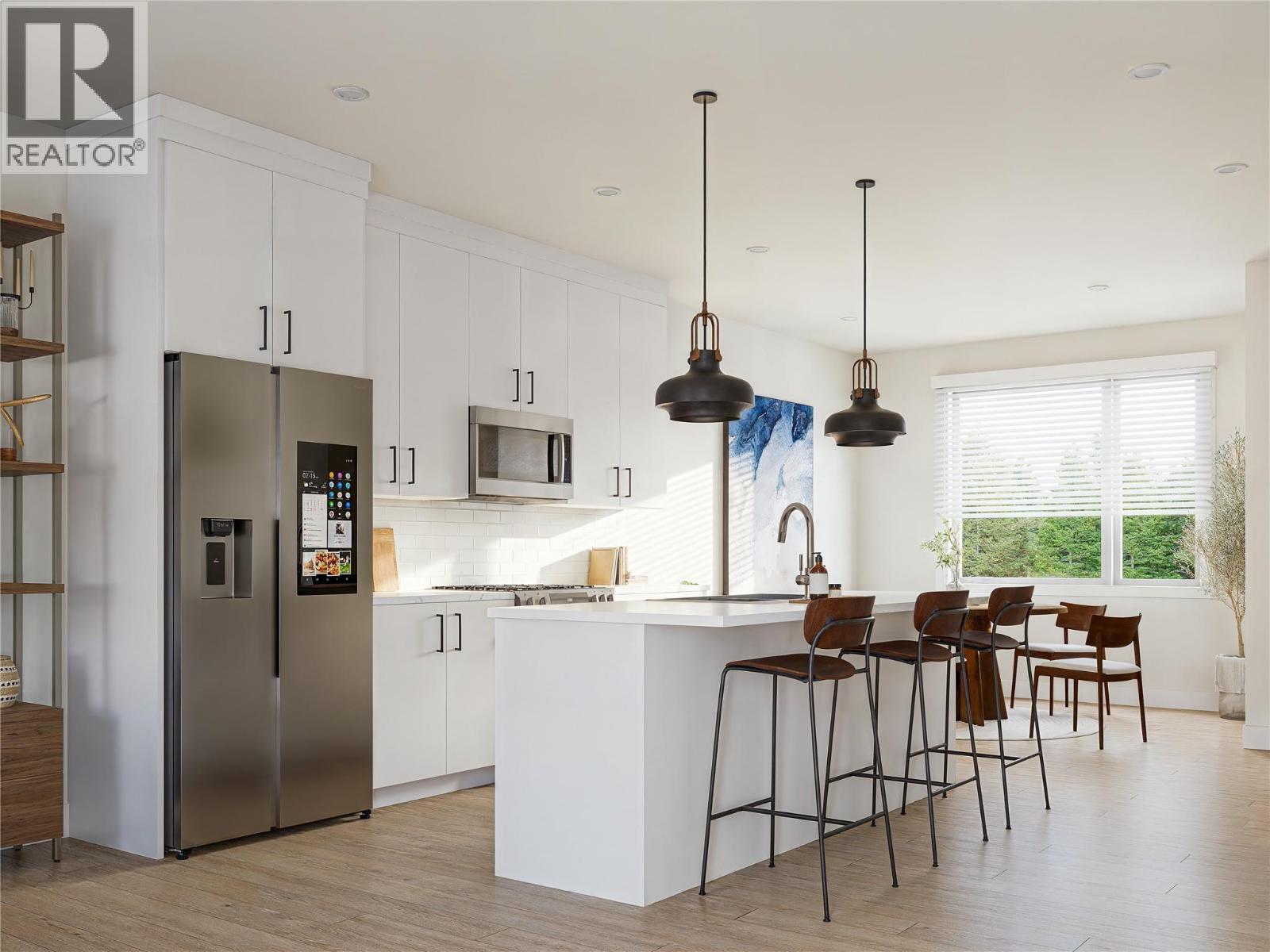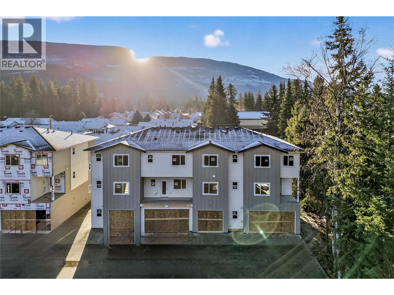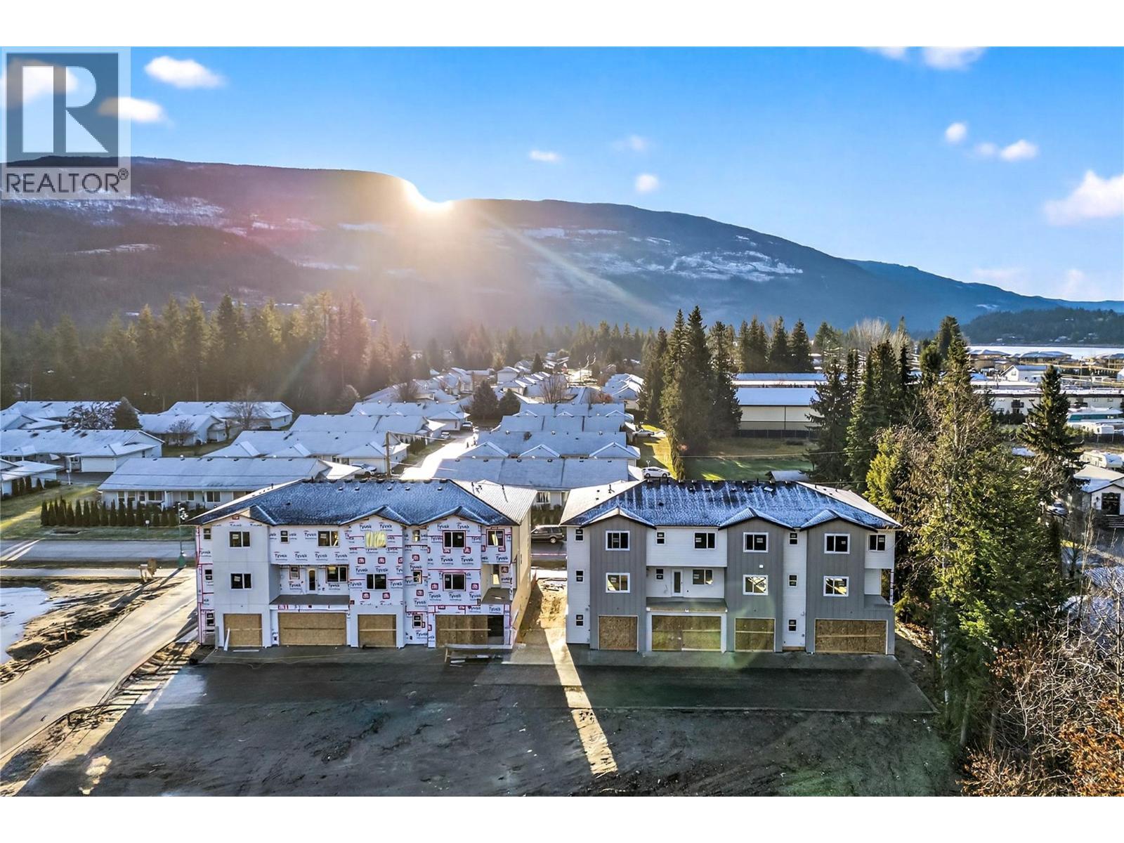 Welcome to #1 at MaraVista in Sicamous. This rare corner unit offers exceptional privacy with only 1 shared wall, making it one of the most desirable locations in the complex. Enjoy 1,582 sq.ft. of modern living plus a large 663 sq.ft. garage w/ 8’ overhead door & 39’ deep x 19.5’ wide —ideal for vehicles, lake toys, bikes, snowmobiles & storage. The open-concept main floor is bright & functional, featuring a stylish kitchen with eating bar, electric fireplace, dining area, powder room, & access to a 7’ x 8.5’ deck for relaxing & entertaining. Upstairs offers 2 spacious bedrooms + den, with both bedrooms featuring private ensuites, plus a full walk-in closet in the primary & convenient upper-floor laundry. Finished with quartz countertops throughout, white wood grained cabinetry, matte black hardware, neutral vinyl plank flooring, & enhanced soundproofing. The exterior includes durable HardiePlank siding, energy-efficient windows, & a high-efficiency mini-split A/C system for year-round comfort. A fully fenced yard adds bonus outdoor space for pets and children. Located in a prime walkable Sicamous location close to downtown, parks, the beach, schools, & everyday amenities. Prewired for fibre optic internet . Only 5% down + $5,000 appliance credit available for first 4 units sold. Low strata fee $356.11/month. Pet restrictions apply. Second of the four season destination only 22 minutes to Salmon Arm, 45 minutes to Revelstoke and 50 Minutes to Vernon. Possession spring 2026. (id:6769)
