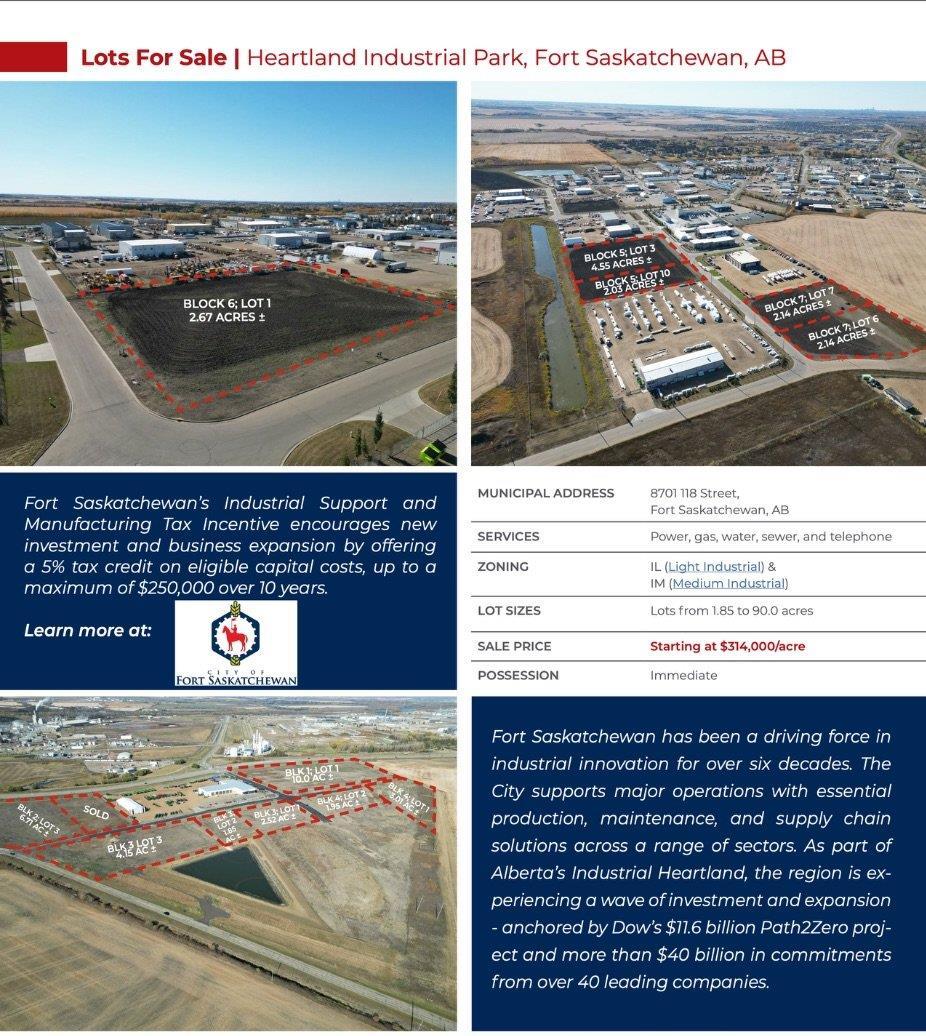 Industrial lots for saleBuild to suit opportunities availableStrategically located in Alberta’s Industrial HeartlandHigh visibility along Highway 15 with traffic at an average of 52,000 vpdTax incentives available (id:6769)