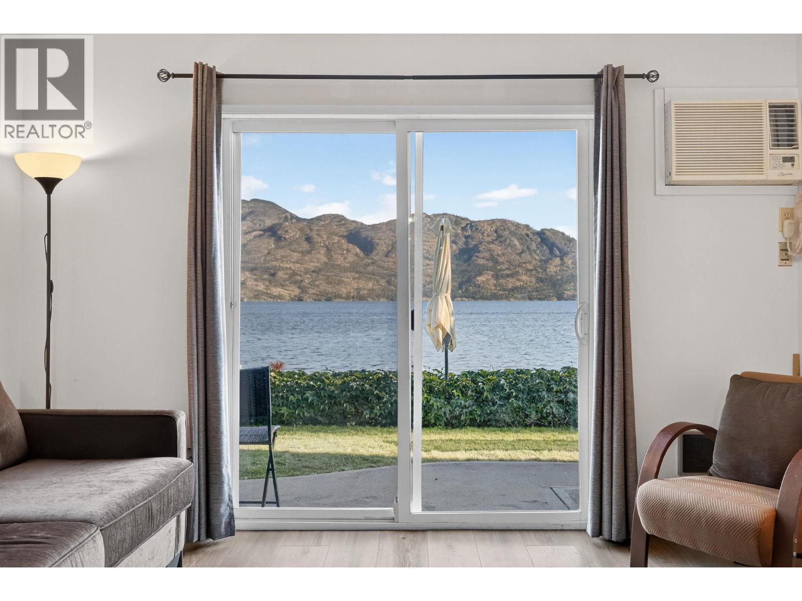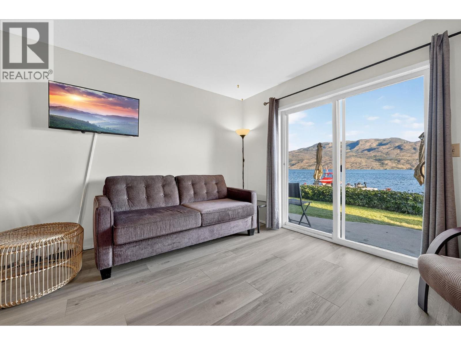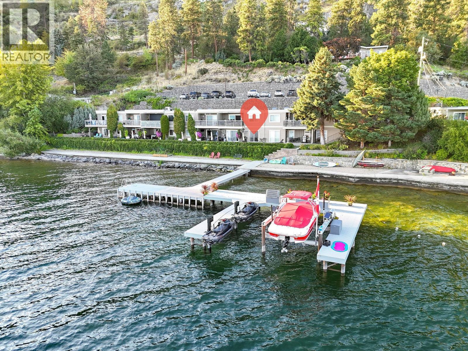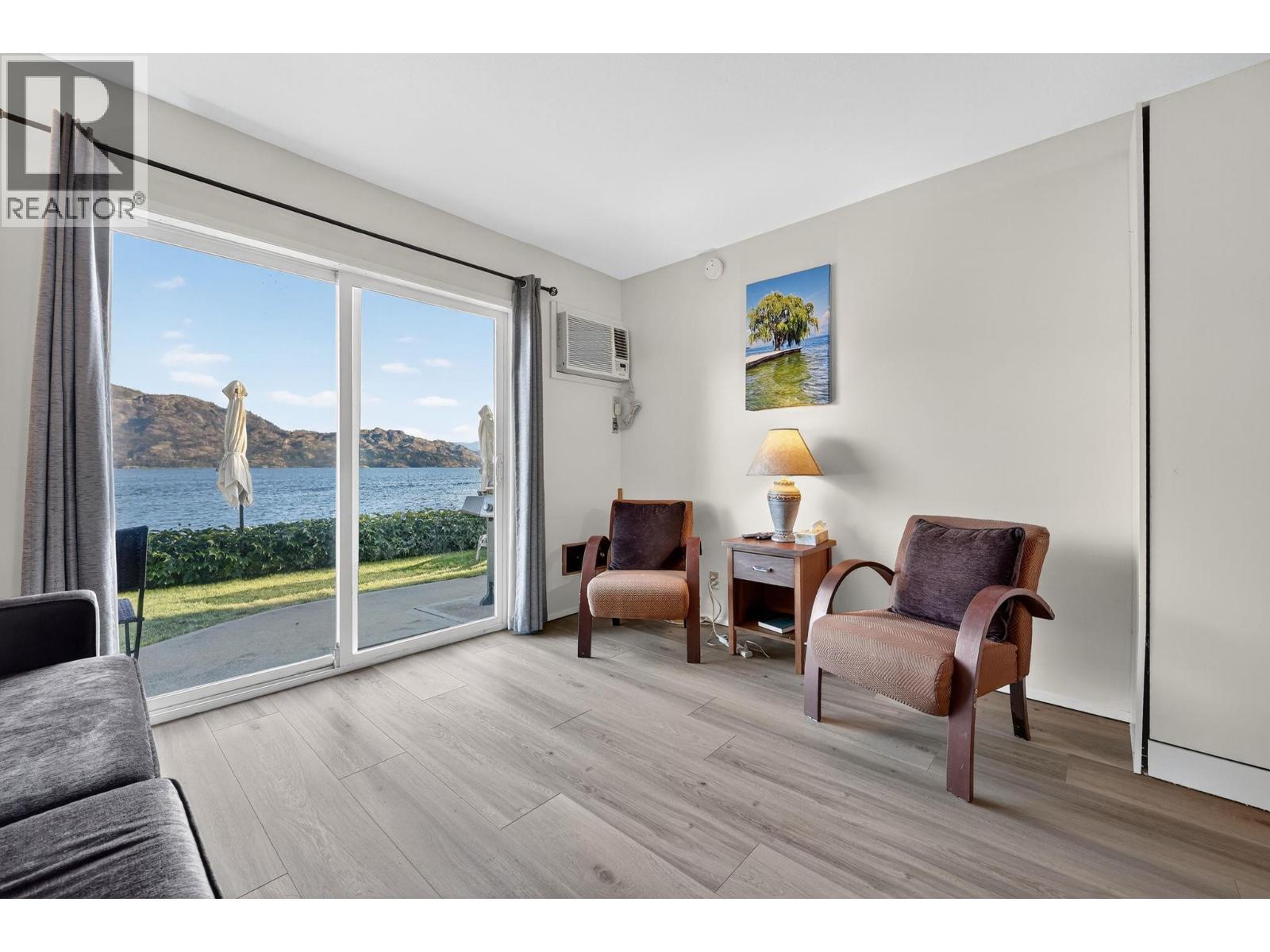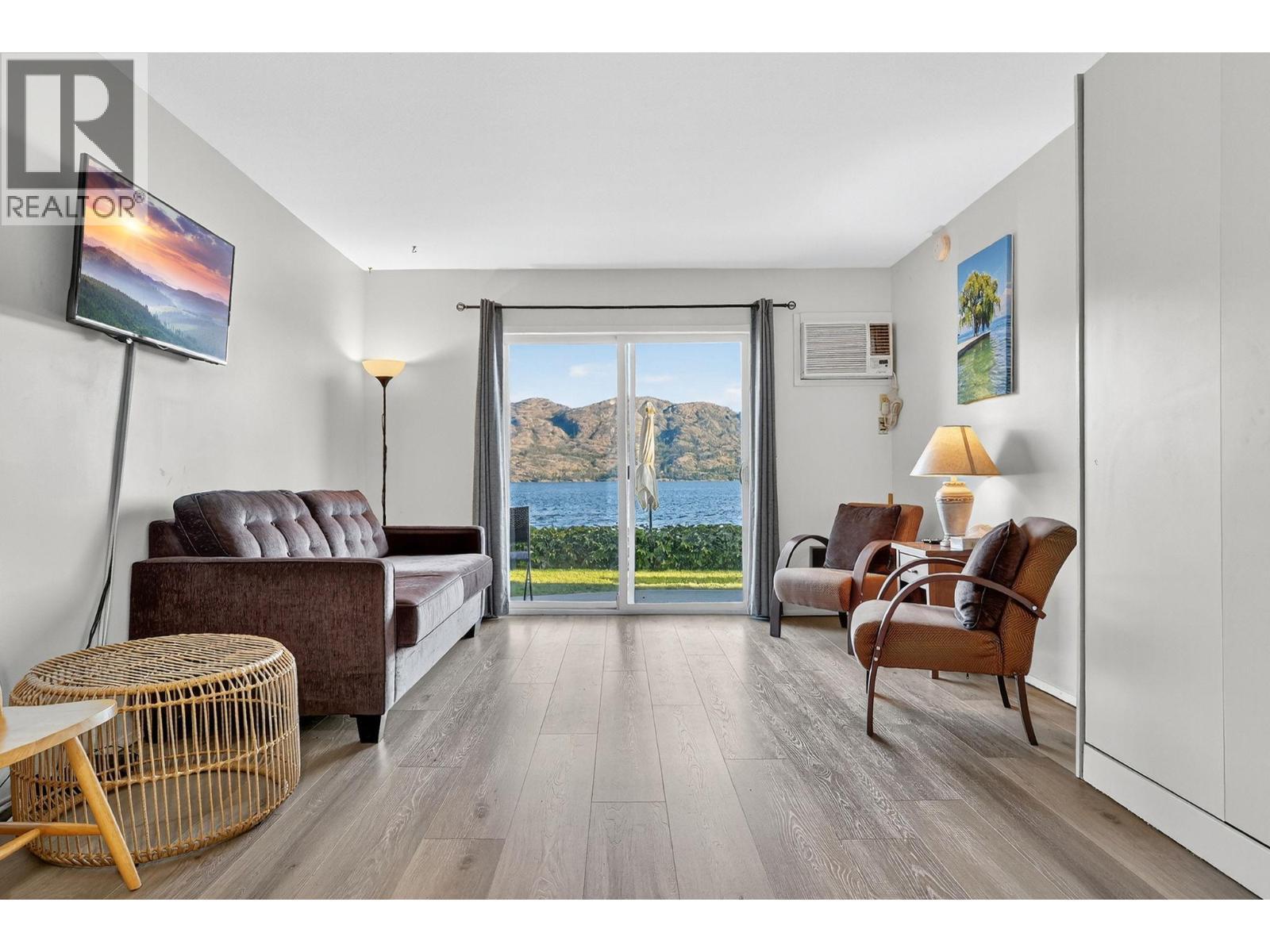 Own your own piece of Okanagan lake front! Best kept secret in the area. This open concept, air conditioned condo in a secure gated community has everything you need to spend your summers on the lake. Sleeps 4, fully furnished, with a new hide a bed, a murphy bed with a new mattress, newer smart TV, tables, chairs and even pots, pans, dishware, glasses, cutlery and a BBQ. New laminate flooring this past year. Wake upright beside the lake and enjoy the lakefront breeze while having a morning cup of coffee on your patio beside the water. Extra storage and 1 assigned parking spot. The resort life comes with many amenities such as boat moorage in the private marina, a clubhouse, private shared dock, boat launch, boat trailer parking, fire pits, coin laundry and ice machine. Telus fibre optic WIFI is available and for extra security the marina and guest parking is monitored by cameras. Great for rental income when you aren't using it yourself. Come see for yourself what lake life can be like. Don't miss out on this great opportunity. These units don't come up for sale very often. (id:6769)