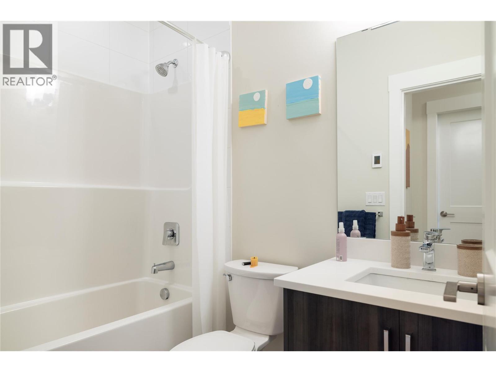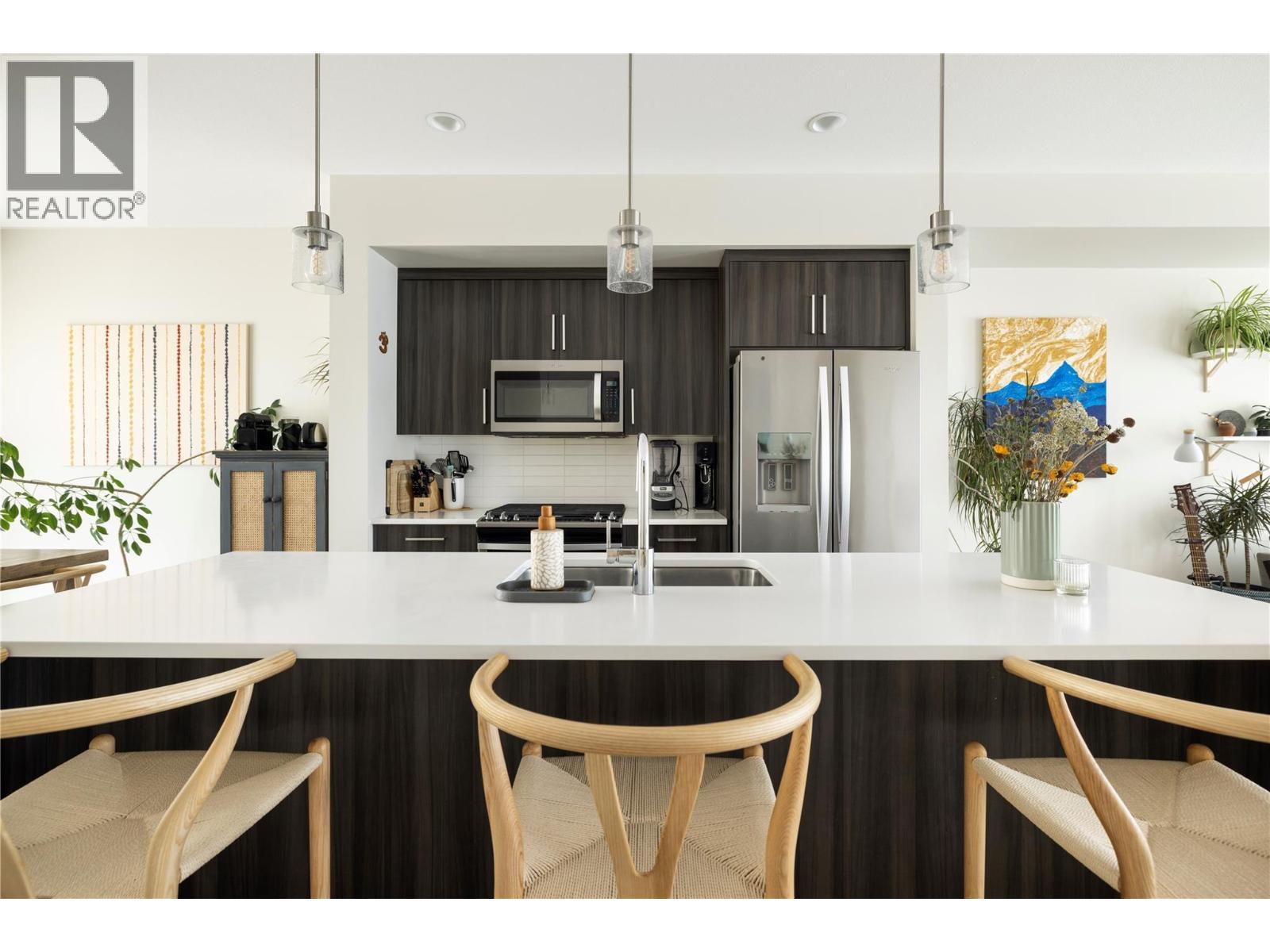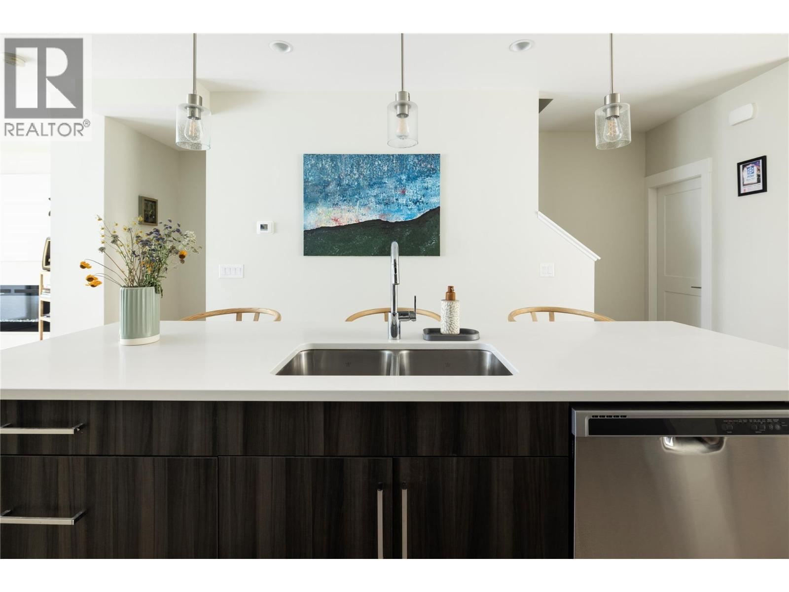 Welcome to this delightful 3-bedroom, 2.5-bathroom townhome. The main floor offers a spacious open-concept kitchen with a gas stove, over-the-range microwave, and an expansive island perfect for casual dining or entertaining in the separate dining area. The living room is enhanced by a gas fireplace, adding comfort and style to modern living. Revel in the luxury of 10' ceilings throughout, complemented by heated bathroom floors for added comfort on chilly mornings. The primary bedroom provides a relaxing retreat featuring a private ensuite and a spacious walk-in closet. Outdoor living is a highlight, starting with a front balcony and a private back patio equipped with a gas line for BBQs and a fenced yard. The unit is filled with morning light, while the west-facing backyard enjoys full sun from noon onward and beautiful sunsets over the mountains and McPollard Pond. For parking and storage, the large tandem garage offers plenty of room in this family-friendly neighborhood. Ideally situated between Wood and Okanagan Lake, you are just a short walk to McPollard Pond, the general store, and local services like a hair salon and chiropractor. A quick trip down the hill brings you to gyms, medical clinics, and Starbucks. This location is perfect for outdoor enthusiasts, sitting directly underneath Spion Kop with endless hiking and biking trails, and only a short drive to world-class beaches, breweries, and cideries. (id:6769)