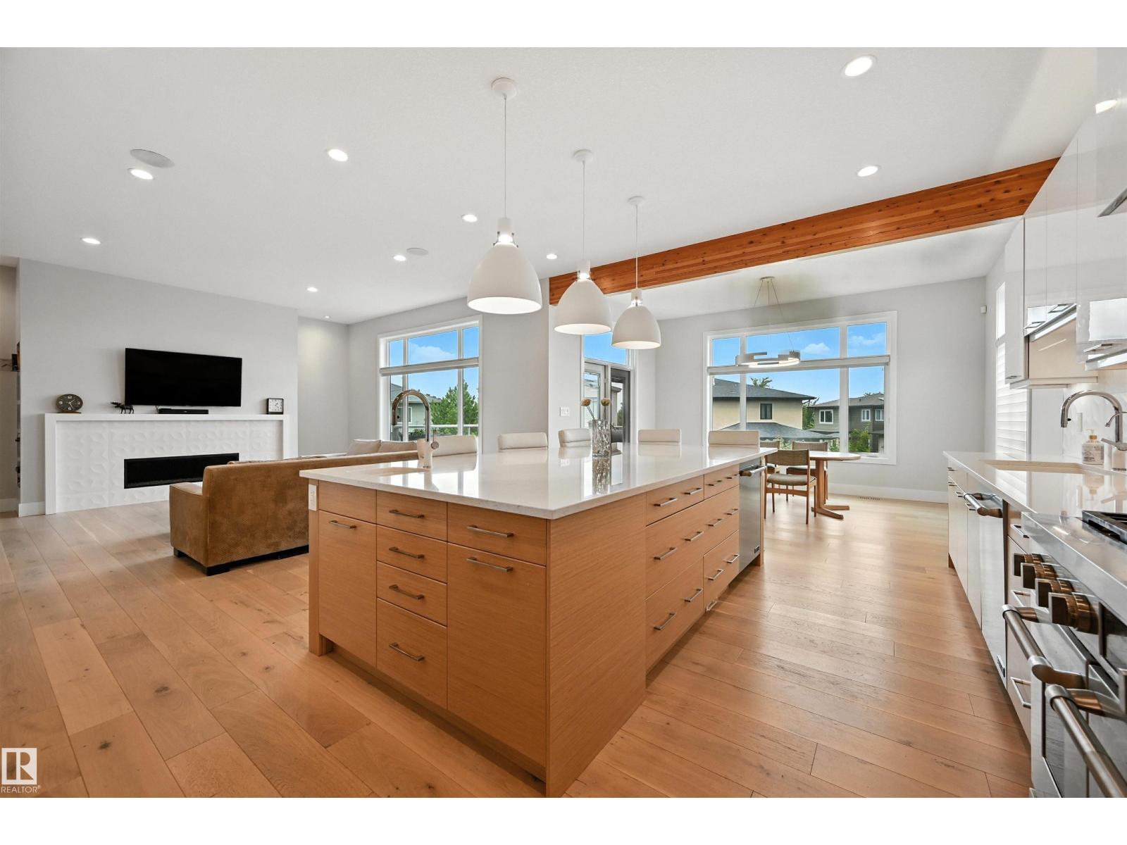 Over 5300sf of total living space custom built by Ace Lange. Fully finished walkout on a 10,393sf pie lot. 3 living areas, 2 full kitchens, 6 bedrooms+den, 6 bathrooms, triple tandem garage & private elevator. Thoughtfully designed spaces & quality craftsmanship throughout. Tastefully chosen finishing palette for broad appeal. Upgraded throughout, including: 10' ceilings on main, 8' doors, multi-zoned heating/cooling, multi-zoned speakers, custom millwork, decorative ceilings & built-ins. Open layout on main level is perfect for family gatherings. Great room w/gas fireplace, main floor office, chef's kitchen w/large nook & direct access to deck for evening bbqs. Generous sized pantry/mudroom. Upper level features a bonus room w/dual functional areas, 3 full bathrooms, 4 bedrooms including an oversized primary suite, 5pc spa ensuite & dressing room. Walkout level offers premium entertaining spaces for extended guest stays; 2nd kitchen, rec areas, 2 bedrooms & 2 bathrooms. Within catchment of 5 schools. (id:6769)