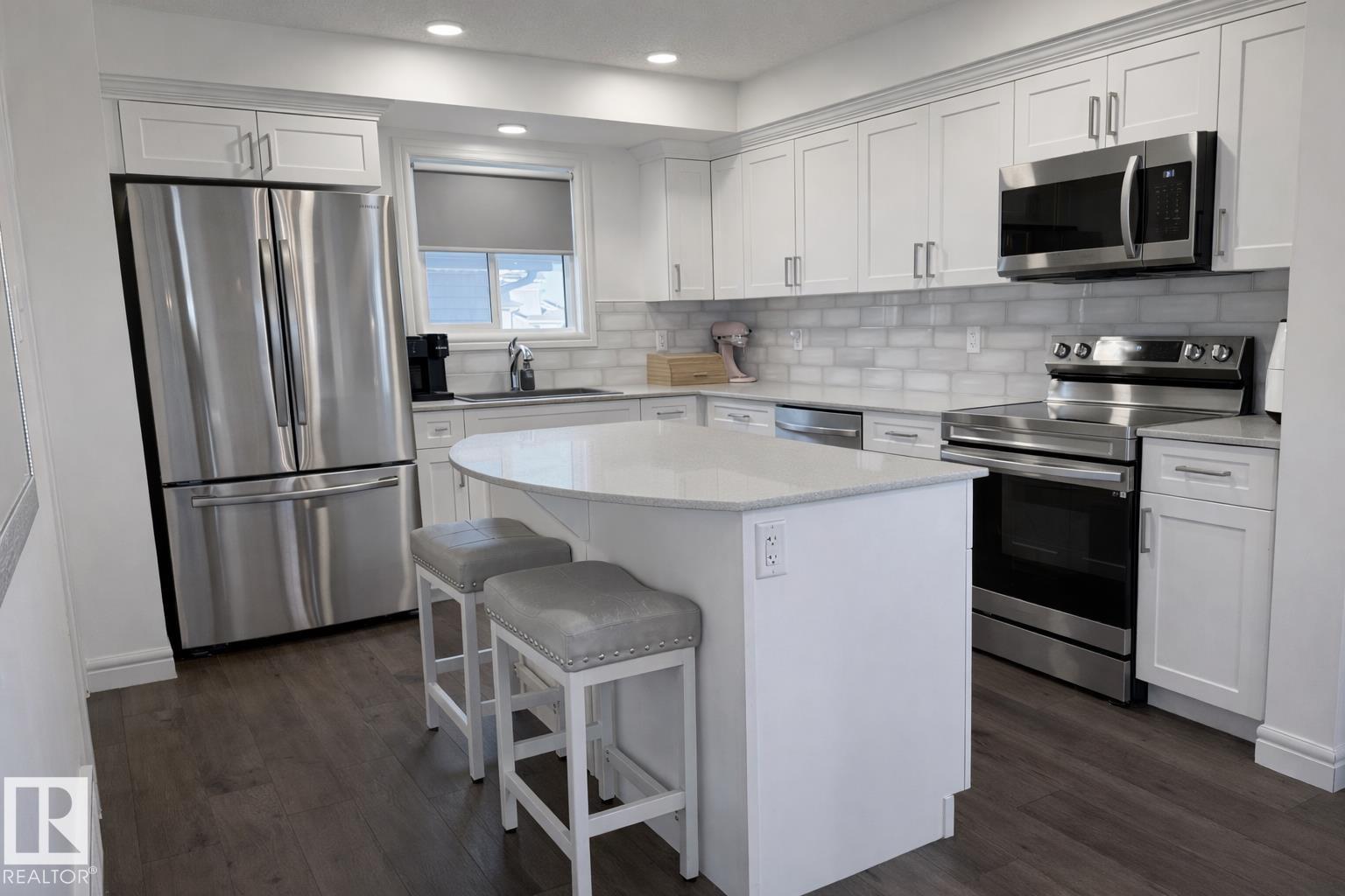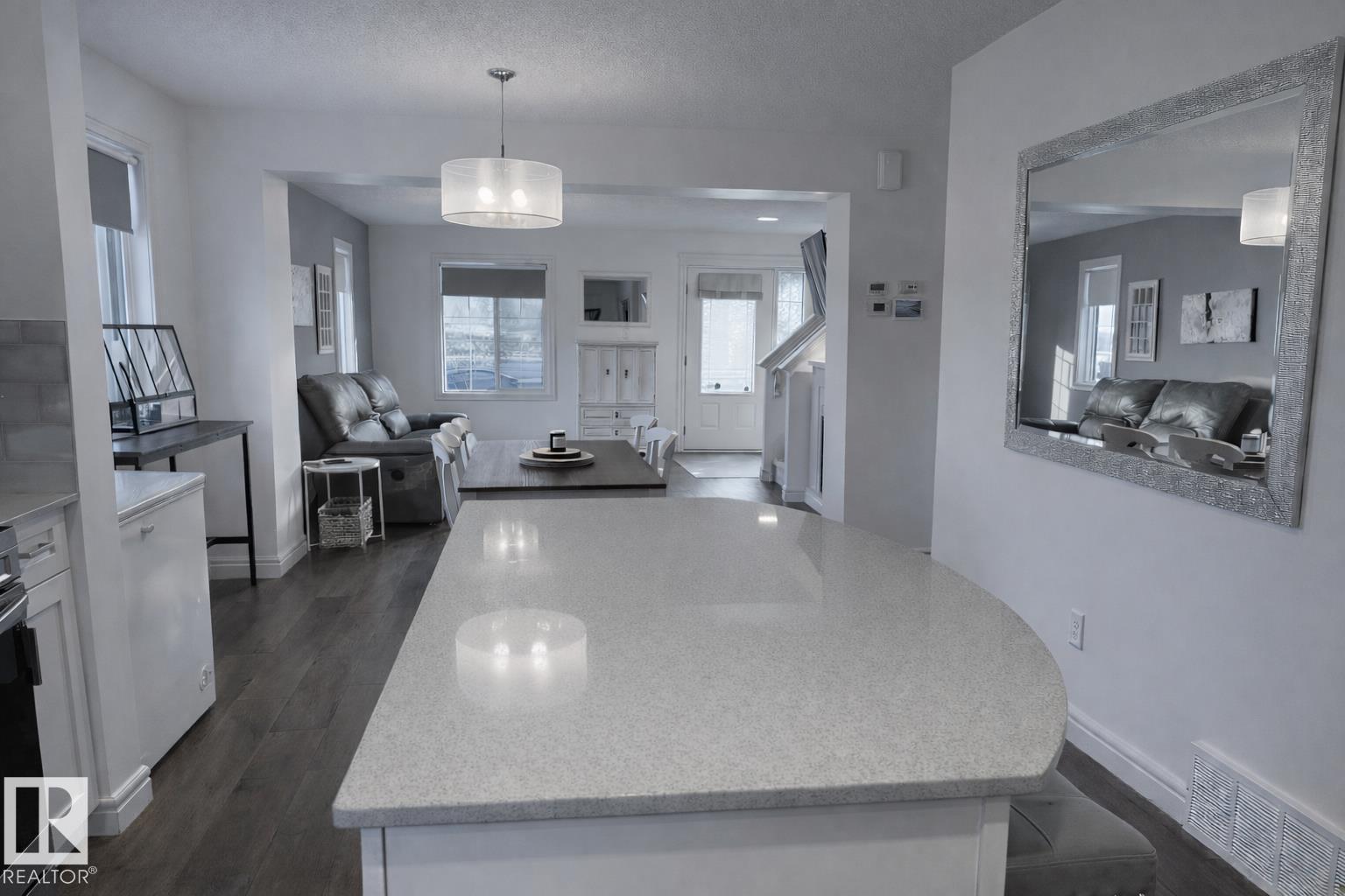 Beautifully maintained, fully finished end-unit townhouse in the family friendly community of Southpointe, ideally located directly across from the K–9 school. This bright home offers extra windows for added natural light and an open, welcoming feel throughout. The main floor features an open-concept living room, dining area, and kitchen with quartz countertops, plus a convenient 2-piece bathroom and laundry at the back entrance. Upstairs, you’ll find three spacious bedrooms, including a large primary with walk-in closet and 4-piece ensuite, along with an additional 4-piece bathroom. The fully finished basement includes a comfortable living room, bedroom, 4-piece bathroom, and plenty of storage. Outside, enjoy a poured concrete patio and exceptional parking with a detached double garage, extended parking pad, and two additional parking stalls behind the garage. Close to shopping, amenities, walking trails, and parks—this move-in-ready home offers outstanding value, space, and location. (id:6769)