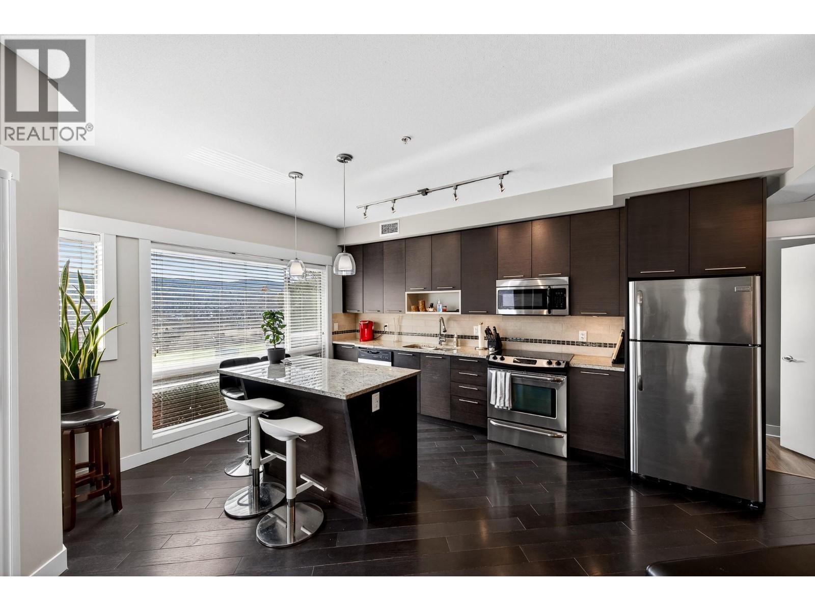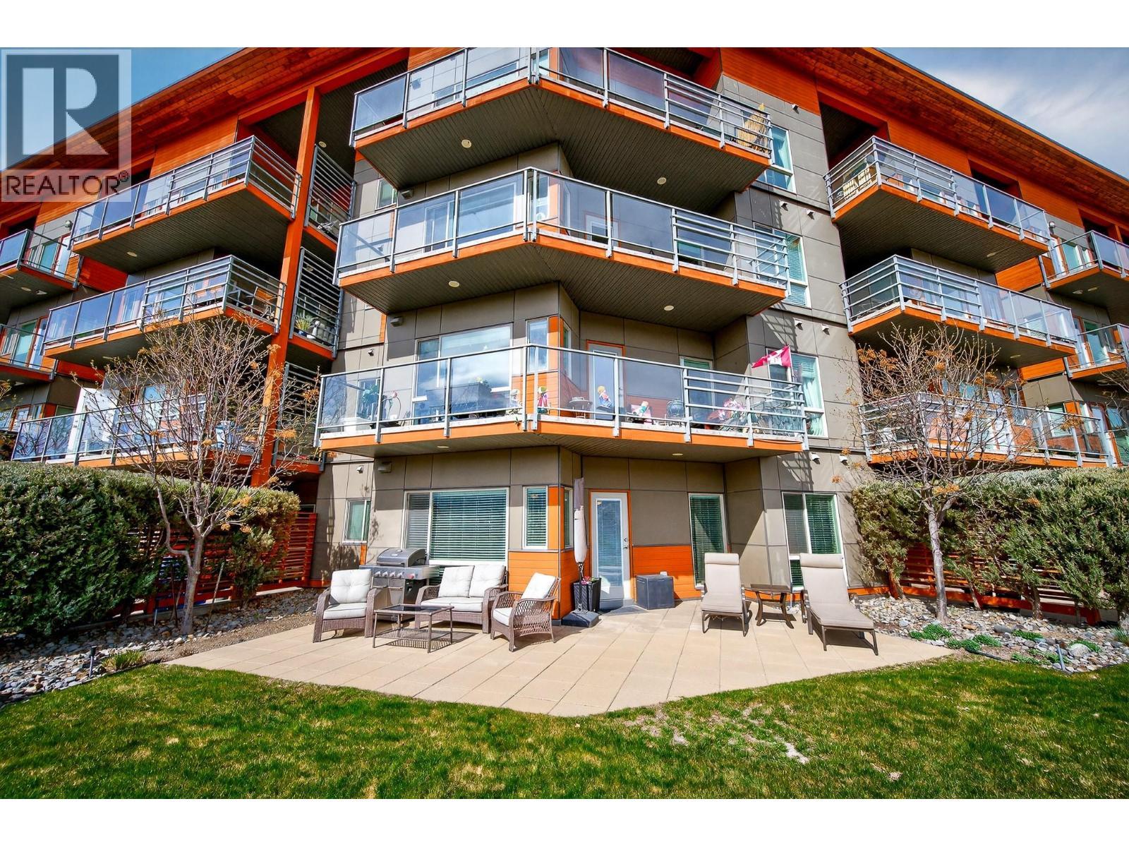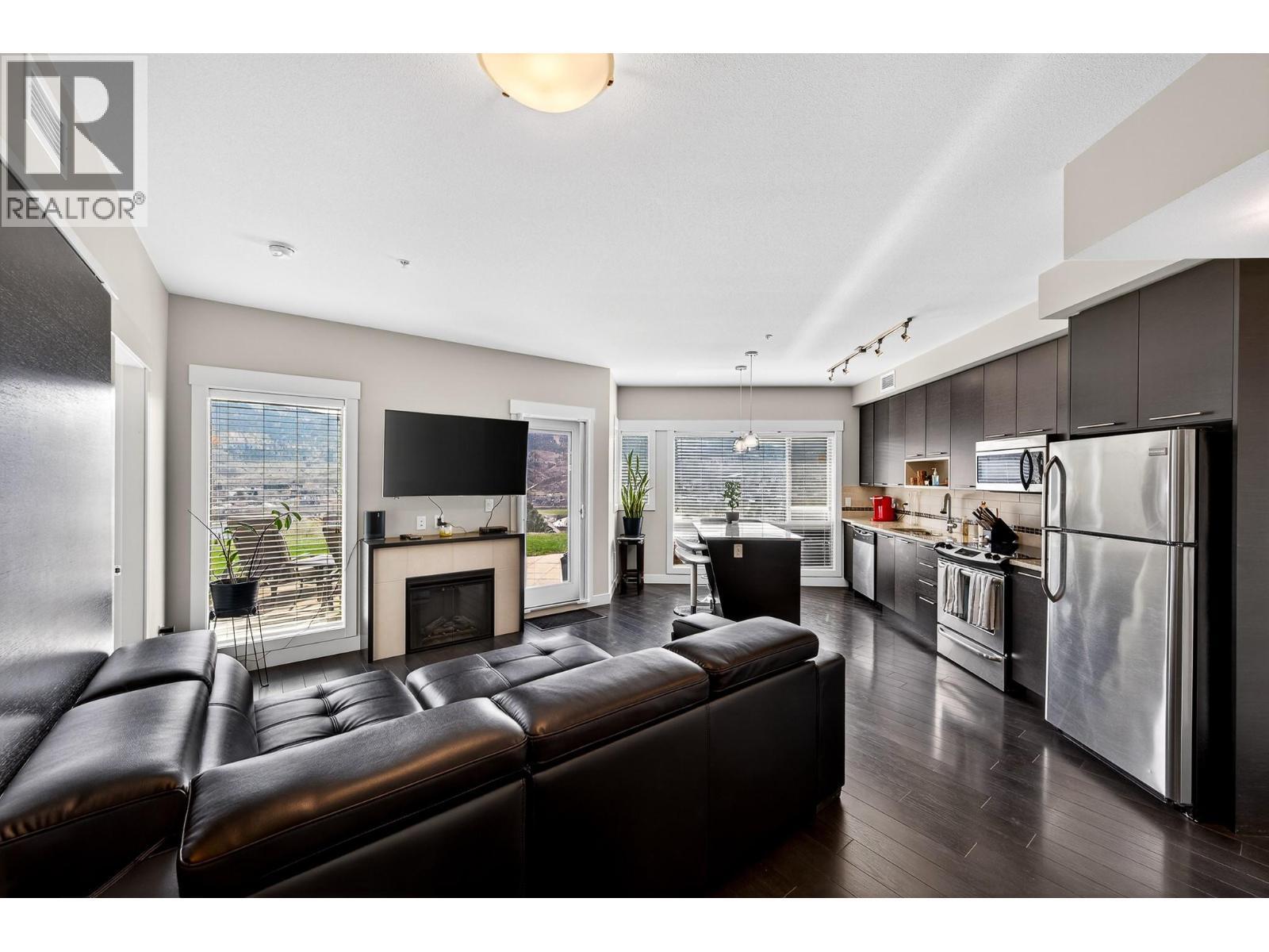 Enjoy unobstructed river and valley views from this rare ground floor 2 bed + den home with an expansive walk out patio—perfect for lounging, BBQs, pets, and easy accessibility. Large picture windows fill the open layout with natural light, highlighting the hardwood floors, cozy electric fireplace, and gourmet island kitchen with granite counters and stainless appliances. The primary bedroom features a private 5 piece ensuite, while the den offers ideal office or gym space. A second bedroom with Murphy Bed, 4 piece bath, and hidden in suite laundry complete the plan. Extras include Large parking stall (#71) and adjacent secure storage, Central A/C, Hot water included in strata, Rentals allowed (no short term) and two pets permitted. Live a relaxed, resort style lifestyle with dining, golf, and scenic walking areas just steps away. (id:6769)