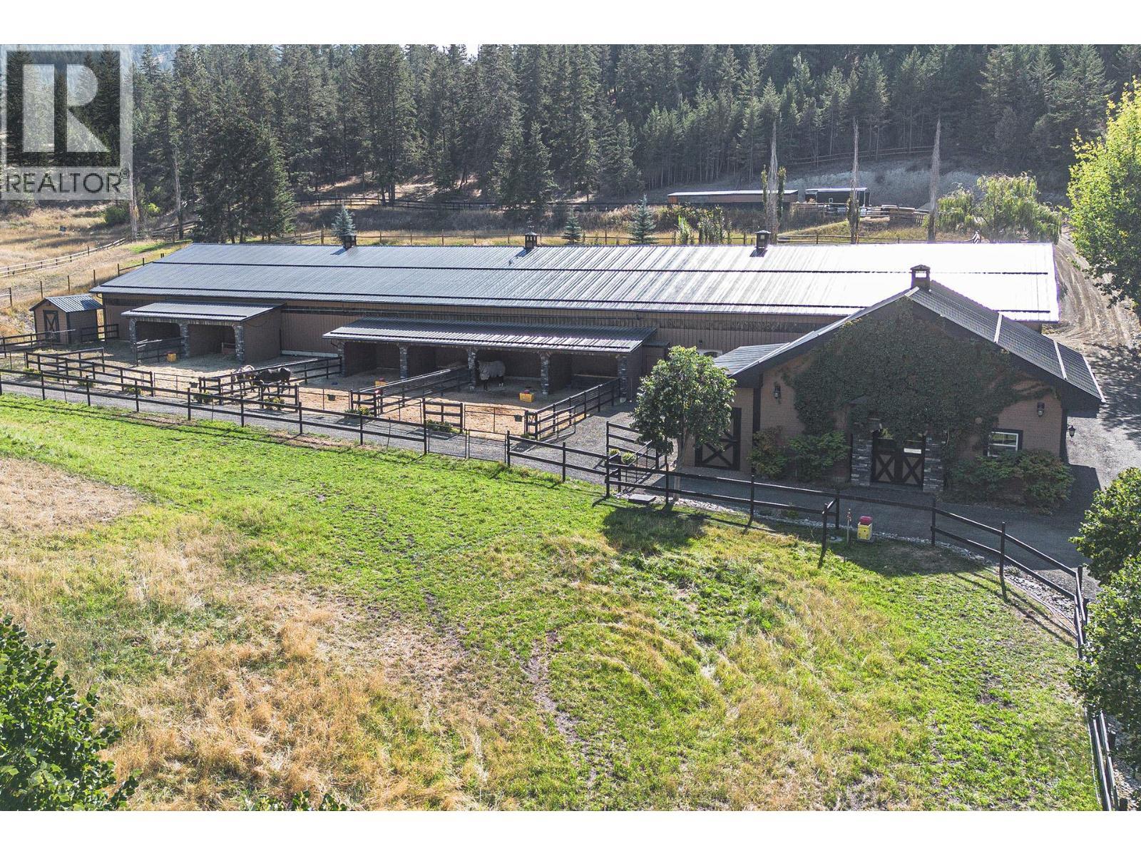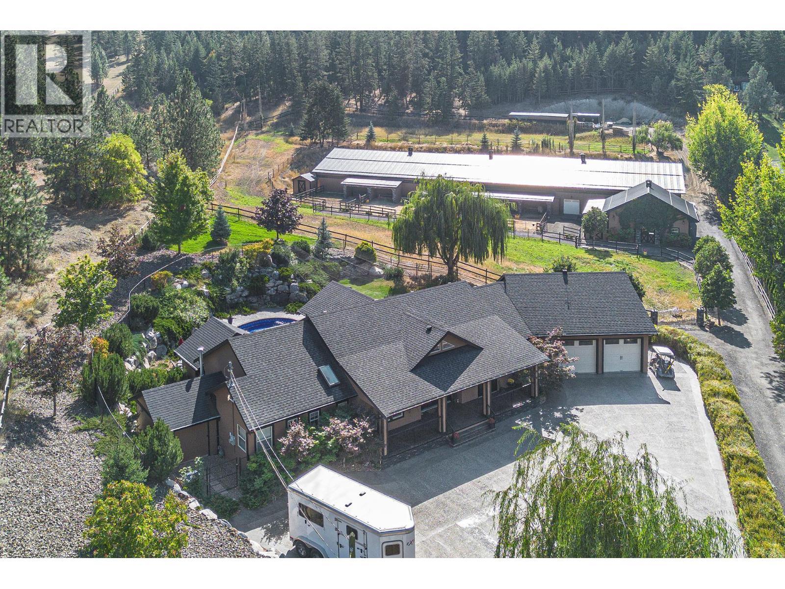 An exceptional opportunity to own a premier equestrian estate offering top-tier living, income potential, and unmatched versatility...all on 16 pristine acres within Kamloops city limits. Designed for both serious equestrian use & lifestyle appeal, the property features a state-of-the-art indoor arena built to competition dressage standards (20m x 60m). The bright, insulated/heated interior offers premium dust-free footing, full-length mirrors, and is ideal for year-round training, clinics, or boarding operations. The thoughtfully designed 3-stall barn includes a spacious foaling stall, insulated/heated interior, rubber flooring with cushioned underlay, and wash rack equipped with advanced red light therapy. Also plans & space for 2 more stalls & arena viewing area from the barn. Above, the loft presents excellent potential for a suite and/or staff quarters, adding flexibility for multi-family accommodation or business use. Fully irrigated & efficiently laid out, the property includes large paddocks with durable, chew-resistant fencing & lush grazing pastures...perfect for maintaining horse health while supporting a professional or boutique equestrian business. The 4,300 sq ft executive home delivers refined comfort with a grand foyer, vaulted ceilings, and an open-concept design. A chef’s kitchen anchors the space, complete with custom cabinetry, granite counters & backsplash, and premium Fisher & Paykel appliances including built-in fridge/freezer, double ovens, double dishwasher, wine cooler, garbage compactor & ice machine. The lower level offers additional value with a spacious family/games room and a self-contained one-bedroom suite...ideal for extended family or on-site staff. Outdoor living is equally impressive, featuring a kidney shaped saltwater pool, expansive patio areas, and beautifully landscaped grounds designed for both relaxation & entertaining. This estate delivers a rare combination of location, infrastructure, & income potential. (id:6769)