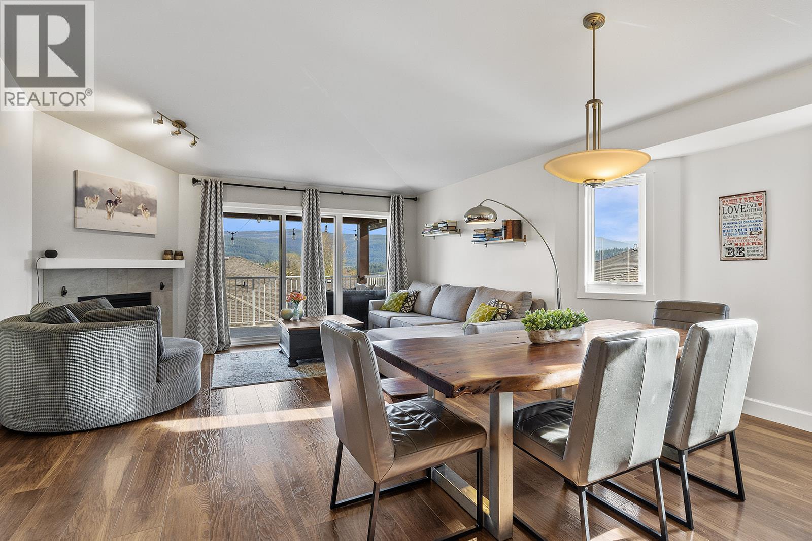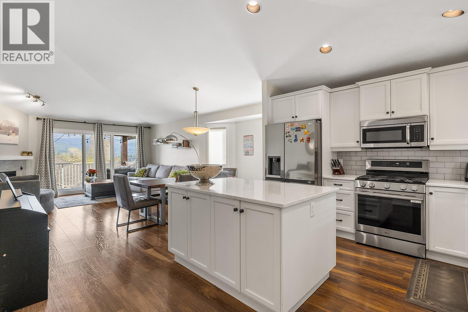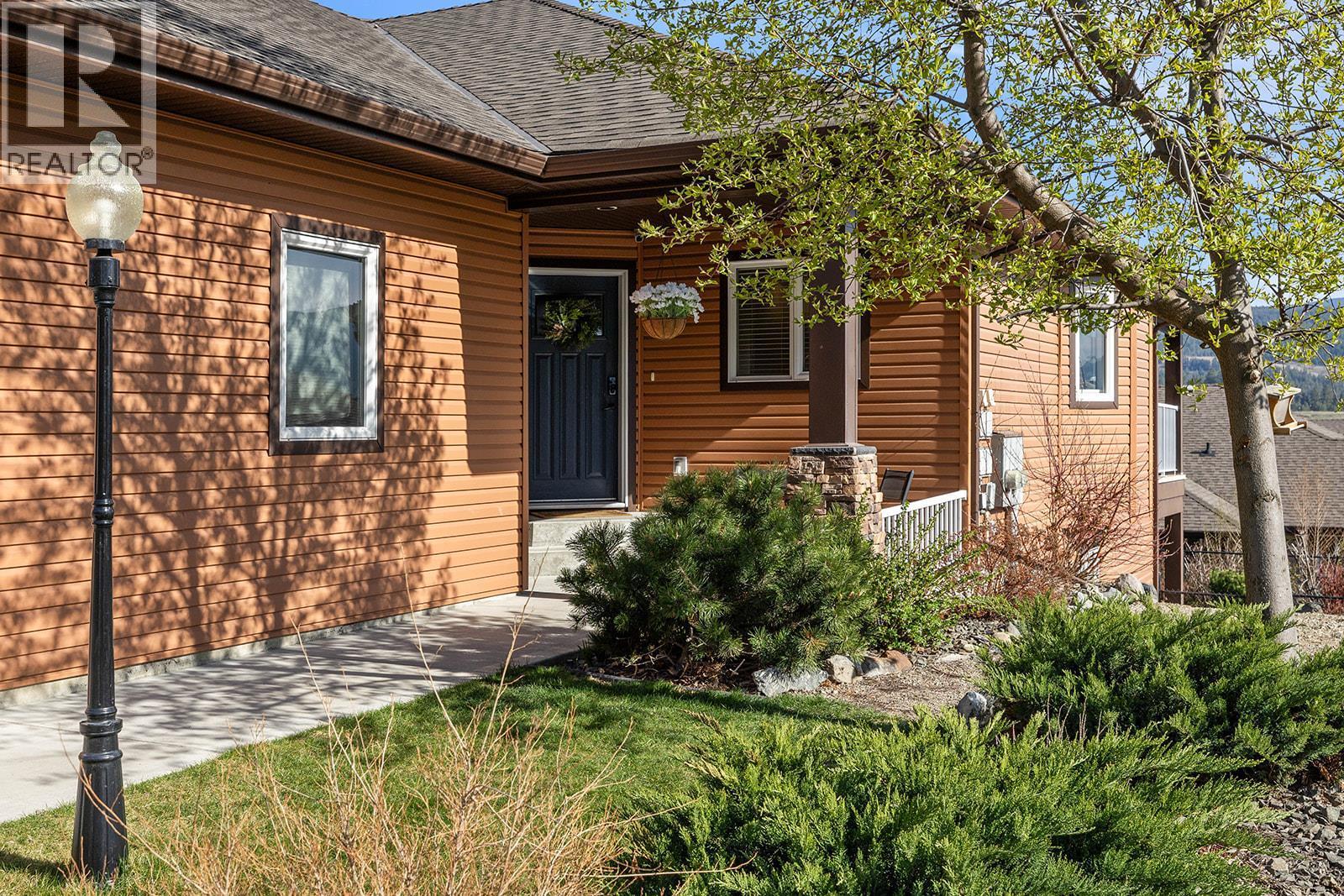 Mountain views and a cul-de-sac address in Black Mountain, this 4-bed, 3-bath walkout rancher in the Blackstone complex delivers low-maintenance living without compromise. The main floor flows through a bright living and dining area with vaulted ceilings and a gas fireplace, opening to a covered deck where the valley and mountain views take centre stage. The kitchen features quartz countertops, a gas range, and an island, built for the way you actually cook and entertain. The primary suite includes a full 4-piece ensuite, with a second bedroom, full bath, and main floor laundry rounding out the main level. Downstairs, the fully finished walkout basement, with its own separate side entrance, adds two more bedrooms, a large rec room, full bath, and generous storage, ideal for guests, teens, or a home office. Outside is a fully fenced landscaped yard with underground irrigation, stone and vinyl exterior, and a double attached garage with two additional uncovered stalls. Steps away from Black Mountain Golf Course, parks, hiking trails, schools, and transit. No thru street. Move-in ready. (id:6769)