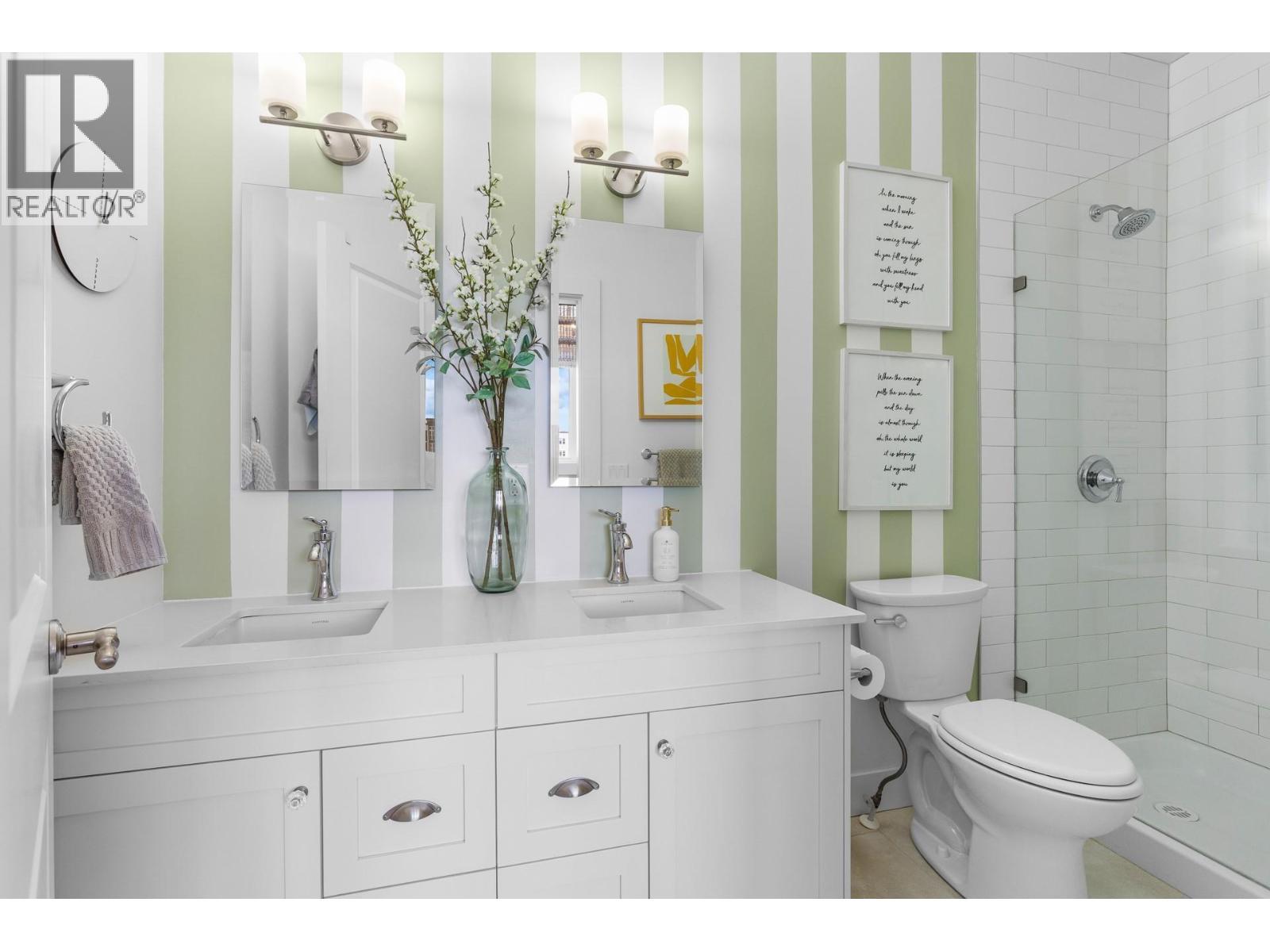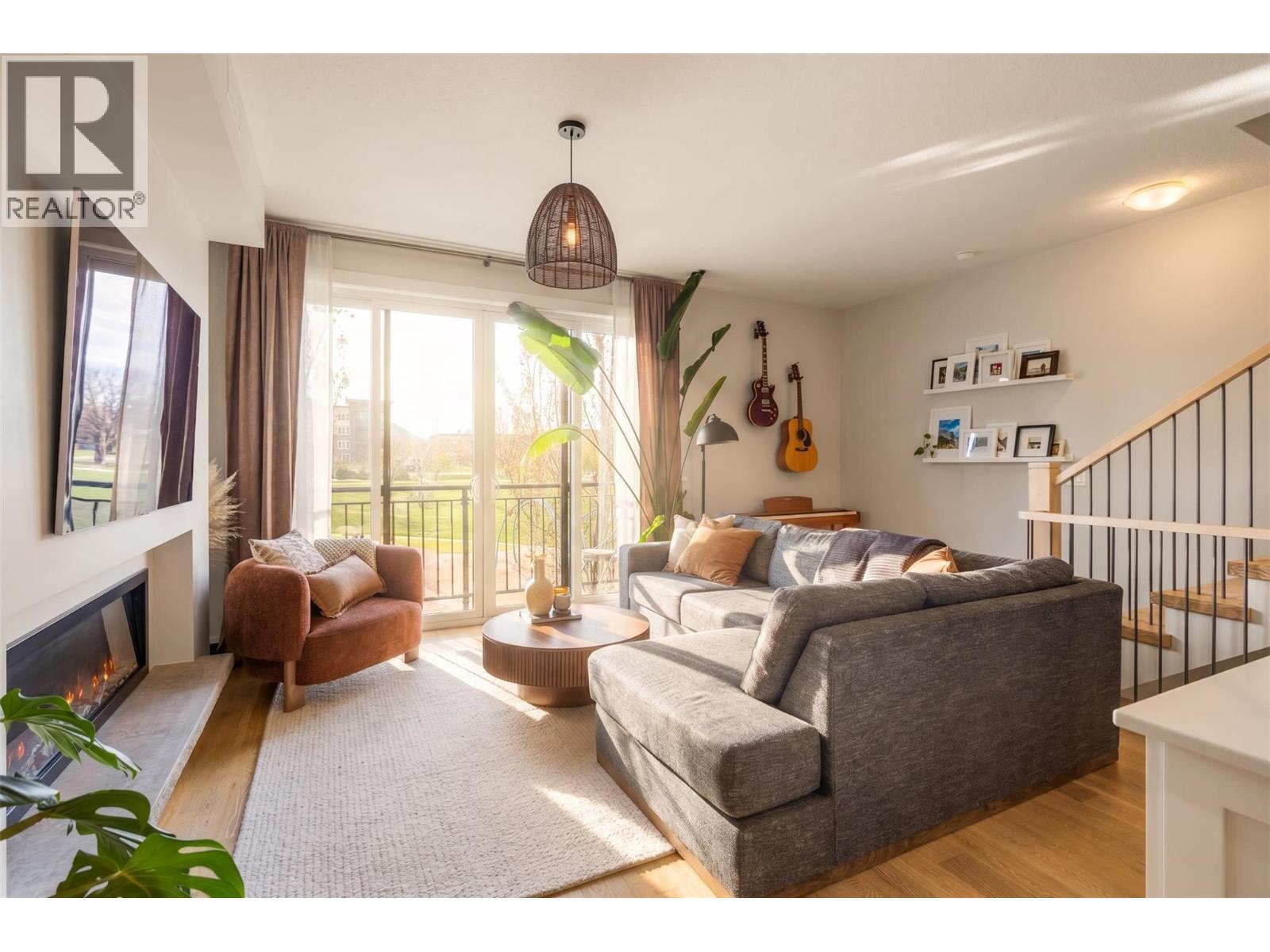 Welcome to Parkview at Central Green, where urban design meets modern comfort in this beautifully appointed townhome. Offering 3 bedrooms and 2.5 bathrooms, this home delivers both space and versatility for everyday living. Thoughtfully customized throughout, each room enhances the home’s chic aesthetic. The bright kitchen features a spacious quartz island with seating for four—perfect for casual dining or entertaining. The adjoining dining area is highlighted by a striking brick feature wall and a custom banquet bench, creating a warm and inviting gathering space. The living room is both bright and spacious, anchored by a decorative fireplace with a concrete hearth, adding a touch of contemporary character. Upstairs, the primary bedroom offers large picture windows, a walk-in closet, and a well refined ensuite with double vanity and a generous shower. A double-car garage provides added convenience and ample storage. Ideally located between Downtown Kelowna and the hospital, this home offers easy access to all amenities. Enjoy nearby transit, parks, and beaches while embracing a truly walkable lifestyle. Don’t miss this opportunity to own a centrally located urban gem. Pet-friendly—allowing up to 2 cats or 2 dogs. Explore the virtual tour link for a 3D walkthrough, full photo gallery, and floor plans. https://unbranded.youriguide.com/106_555_buckland_ave_kelowna_bc/ (id:6769)