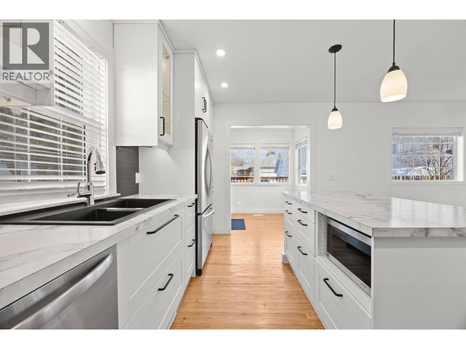 Discover this bright and inviting 4-bedroom, 2-bathroom home located in the heart of the highly sought-after Kelowna South neighborhood. Filled with character and modern updates, this south-facing property is situated on a RU6 zoned lot with carriage house potential. The home welcomes you through a bright foyer leading into a spacious living room. The modernized, airy kitchen features a door opening directly to the backyard. The main floor includes two well-sized bedrooms, one of which features french doors leading to the deck. Upstairs, you will find the primary bedroom, an additional bedroom, and a bathroom. The basement offers a finished den/flex room, laudry, while the remaining unfinished space provides a versatile area for a workshop or games room. You can enjoy entertaining outdoors on the large deck and appreciate maintenance-free living with synthetic turf in both the front and back yards. Parking & Storage includes a single-car garage 17'by 20'11"", a large shed, and a driveway with room for four cars or an RV. The laneway access offers future potential for a carriage home. Recent Updates include the AC and furnace that were replaced in 2017, and a new irrigation system was installed in 2023. The location is perfect as you are a short stroll from Kelowna’s best attractions, including pristine beaches, trendy restaurants, Pandosy Village, Okanagan College, downtown and the hospital. Outdoor enthusiasts will also appreciate the proximity to the Sutherland Transportation corridor. (id:6769)