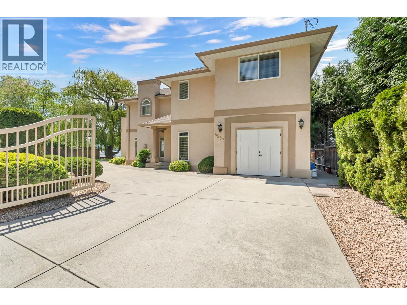 RARE ~ 100 ft. of SKAHA LAKEFRONT – easy walk-on access, flat and sandy, with an immaculate semi-custom home on Penticton city water and sewer. Swim or paddle right from your beach, head up to Skaha Bluffs, meet friends at the neighbourhood pub, and benefit from close proximity to all amenities for summer or year-round living. The property is securely gated, offering privacy on a beautifully landscaped lot complete with a weeping willow, natural shoreline, and panoramic views. This home is filled with light in every room, with dual aspect windows framing views of the lake and surrounding hills. Relax by the lake, lounge in the sunroom, or cozy up in the family room—all conveniently located near the open kitchen, complete with Bertazzoni range, powder room, and laundry area. Upstairs opens to a bright landing suitable for an office or flex space, plus three spacious bedrooms, including a well-appointed primary bedroom overlooking the lake. An ensuite, walk-in closet, four-piece bathroom, and ample storage ensure comfort for homeowners and guests. Take advantage of the large outdoor patio and shower, easy-maintenance yard, and indoor storage for garden equipment. This highly sought-after wide, flat lakefront could accommodate a future dock or be enjoyed as is with unobstructed views. Whether you're seeking a full-time residence, a luxurious vacation retreat, or an investment opportunity, this rare lakefront offering captures the best of Okanagan living. (id:6769)